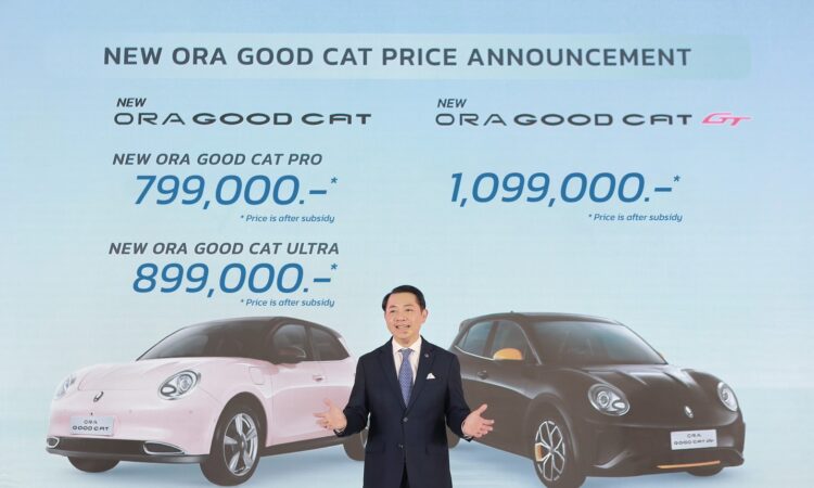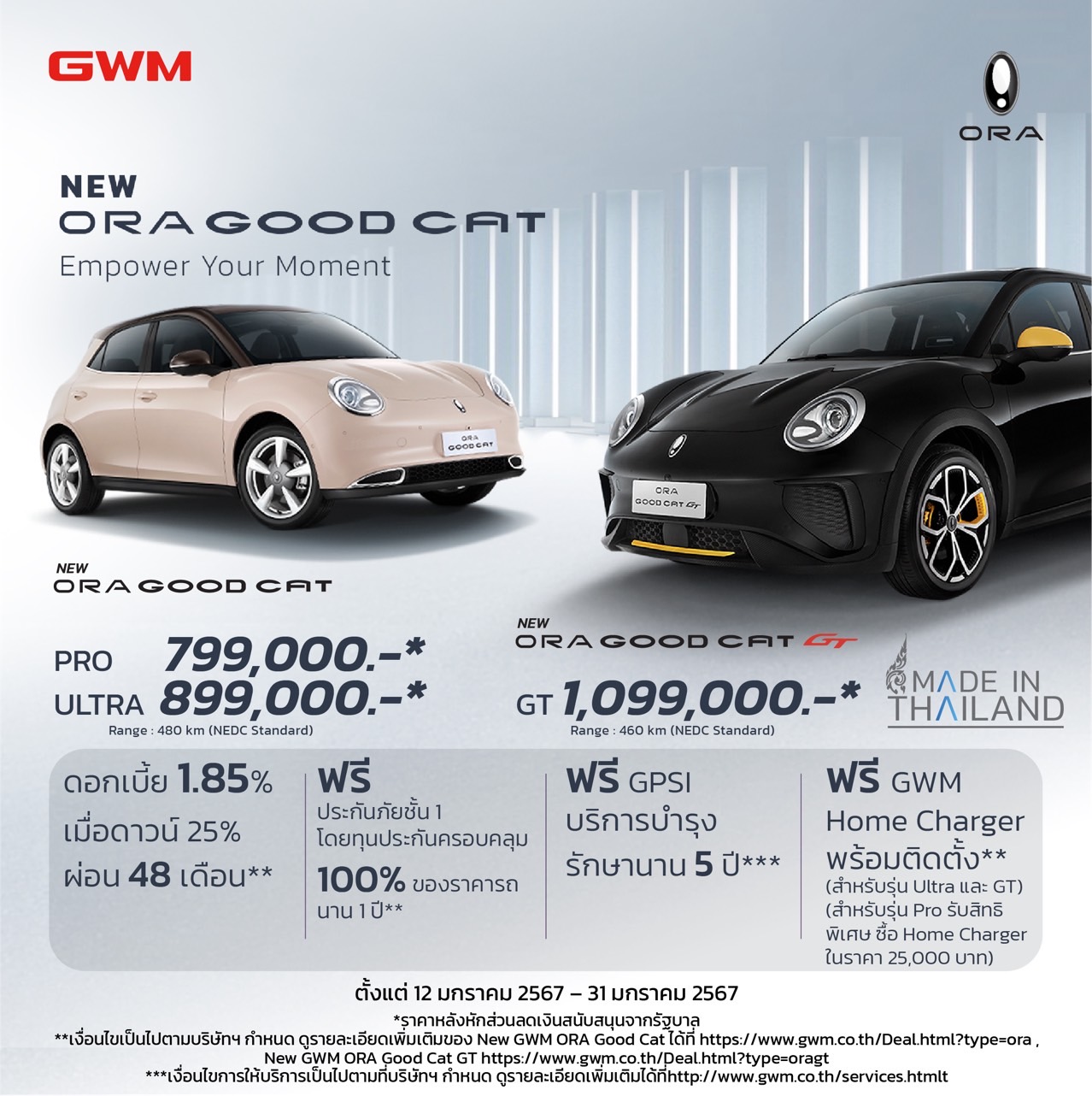 เกรท วอลล์ มอเตอร์ กลับมาปลุกกระแสรถยนต์พลังงานไฟฟ้าในประเทศไทยอีกครั้ง เปิดตัวและประกาศราคา New GWM ORA Good Cat จากสายการผลิตในไทยอย่างเป็นทางการ โดย New GWM ORA Good Cat มาพร้อมกับ 3 รุ่นย่อย รุ่น PRO ราคา 799,000 บาท รุ่น ULTRA ราคา 899,000 บาท และ GT ราคา 1,099,000 บาท ตอกย้ำความมุ่งมั่น