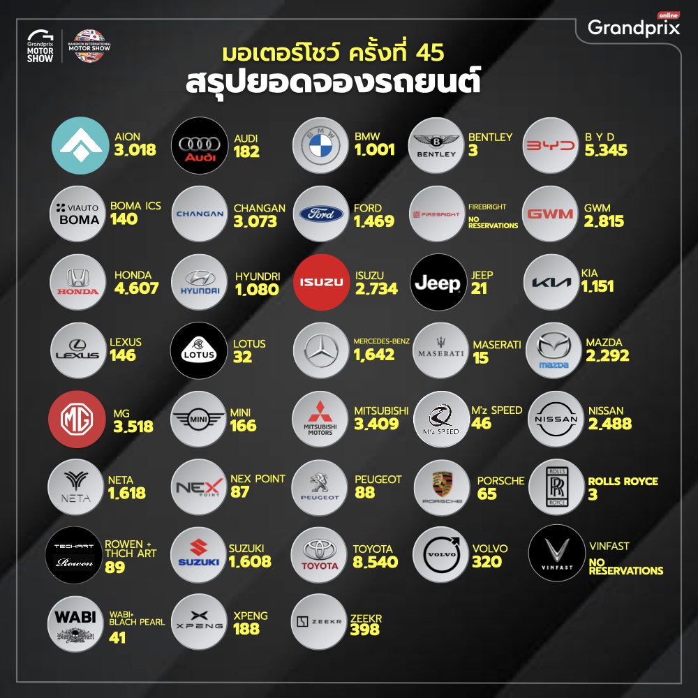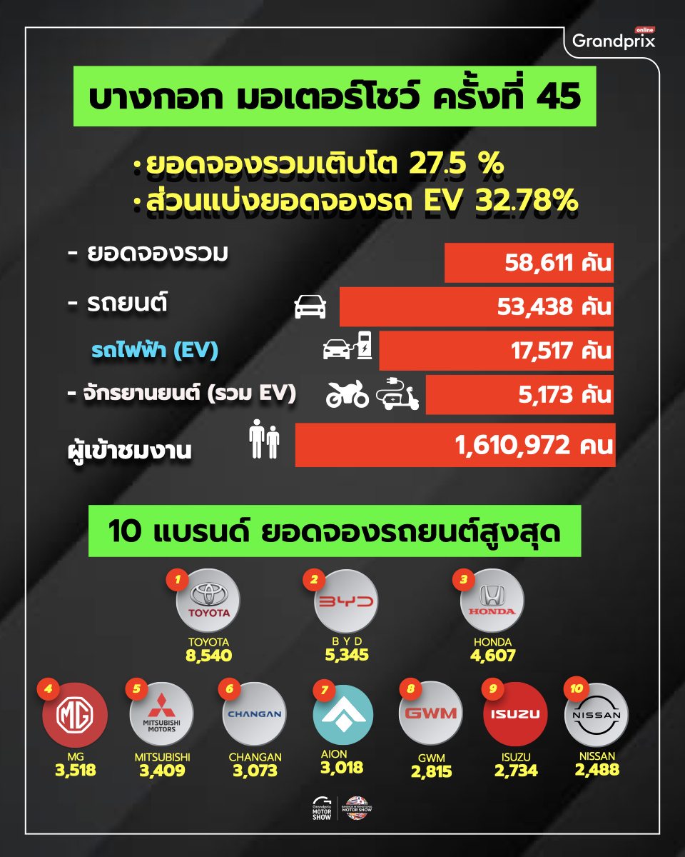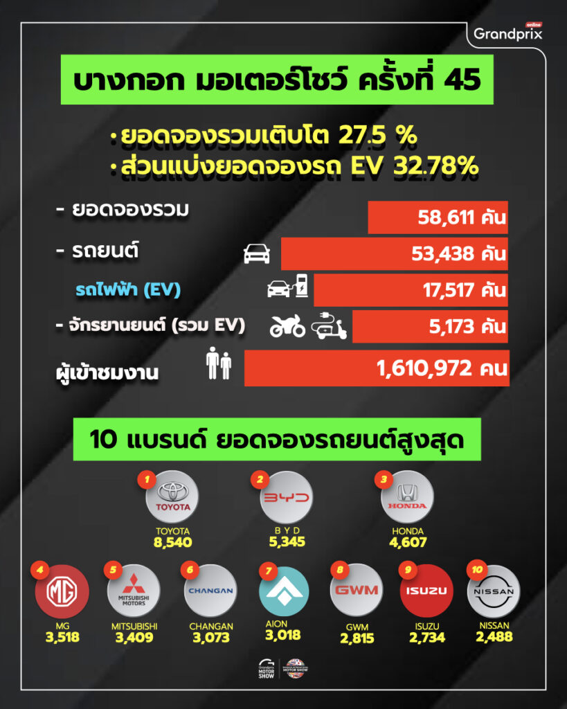 นายจาตุรนต์ โกมลมิศร์ ประธานเจ้าหน้าที่ปฏิบัติการ บริษัท กรังด์ปรีซ์ อินเตอร์เนชั่นแนล จำกัด (มหาชน) ในฐานะรองประธานจัดงาน “บางกอก อินเตอร์เนชั่นแนล มอเตอร์โชว์ ครั้งที่ 45” เปิดเผยว่า “เนื่องจากการจัดงานในปีนี้ มีผู้ประกอบการรายใหม่ๆ เข้าร่วมงานเป็นจำนวนมาก โดยเฉพาะผู้ประกอบการจากประเทศจีนและเวียดนาม ที่นำรถยนต์ไฟฟ้ารุ่นใหม่ๆ เข้ามาให้ผู้บริโภค เลือกชม เลือกซื้อ เป็นจำนวนมาก โดยมีราคาตั้งแต่หลักแสนปลายๆ ไปจนถึงหลักล้านต้นๆ ทำให้มีผู้บริโภคให้ความสนใจเข้าร่วมงานมากถึง 1,610,972 คน ส่งผลให้ยอดจองรถยนต์และรถจักรยานยนต์ภายในงานมีมากกว่า 58,611 คัน แบ่งเป็น รถจักรยานยนต์ 5,173 คัน และรถยนต์ 53,438 คัน โดยมากกว่า 32.78 เปอร์เซ็นต์ เป็นยอดจองรถยนต์ไฟฟ้าที่เกิดขึ้นภายในงาน”