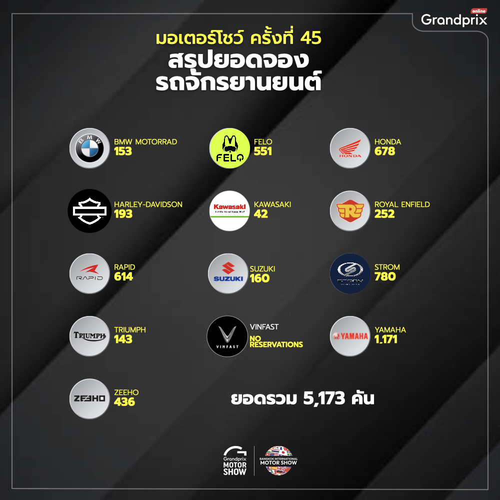 ขณะที่รถจักรยานยนต์ในปีนี้มีแบรนด์จากประเทศจีนเข้าร่วมงานถึง 5 แบรนด์ ซึ่งเป็นรถจักรยานยนต์ไฟฟ้าที่ได้รับความสนใจจากผู้เข้าชมงานไม่น้อยเช่นกัน ทำให้มียอดจองรถจักรยานยนต์ภายในงานรวมทั้งสิ้น 5,173 คัน