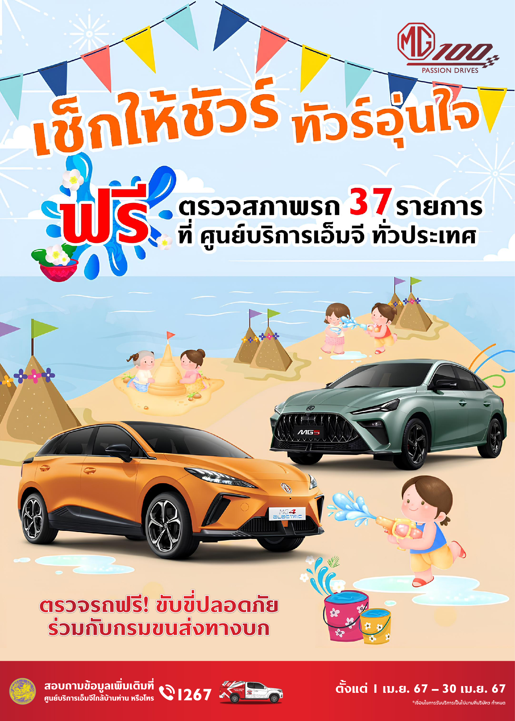 ด้วยความสนใจจากลูกค้าที่ยังคงมีอย่างต่อเนื่อง เอ็มจี จึงขยายระยะเวลาแคมเปญพิเศษในงาน MOTOR SHOW 2024 ไปจนถึงวันที่ 30 เมษายน 2567 โดยสามารถดูรายละเอียดแคมเปญทุกรุ่นได้ที่ https://www.mgcars.com/th/Promotion และให้ความสำคัญกับลูกค้าเอ็มจีปัจจุบัน ผ่านแคมเปญ “เช็กให้ชัวร์ ทัวร์อุ่นใจ” เชิญชวนให้ลูกค้านำรถเข้ารับบริการตรวจเช็กสภาพ ฟรี! สูงสุด 37 รายการ ตั้งแต่วันนี้ – 30 เมษายน 2567 ที่ศูนย์บริการเอ็มจี ทั่วประเทศ เพื่อความอุ่นใจ และเพิ่มความปลอดภัยในการขับขี่ช่วงเทศกาลสงกรานต์ โดยนัดหมายเข้ารับบริการล่วงหน้าที่ศูนย์บริการเอ็มจีกว่า 150 แห่งทั่วประเทศ หรือติดต่อสอบถามเพิ่มเติมที่ศูนย์บริการลูกค้า โทร. 1267 km