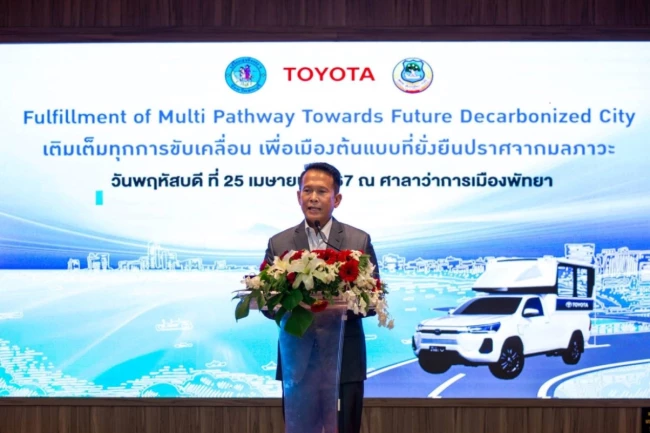 ทั้งนี้ เพื่อศึกษาในด้านโครงสร้างพื้นฐานที่จำเป็น ตลอดจนการรับรู้ของผู้คน และพฤติกรรมการใช้งาน ภายใต้สภาพแวดล้อมจริงในประเทศไทย โตโยต้าจึงได้เริ่มโครงการทดลองเพื่อศึกษาวิจัยข้อมูลดังกล่าว ภายใต้ “โครงการพัฒนาเมืองต้นแบบที่ยั่งยืนปราศจากมลภาวะ” ณ เมืองพัทยา โดยร่วมกับพันธมิตรในภาคส่วนต่างๆ อาทิ องค์กรที่มีความเชี่ยวชาญด้านพลังงาน ตลอดจนภาครัฐ และผู้ประกอบการในจังหวัดชลบุรี ร่วมจัดสร้าง ระบบนิเวศเพื่อรองรับการใช้งานยานยนต์ที่เป็นมิตรต่อสิ่งแวดล้อม ในระบบส่งกำลังที่หลากหลาย ภายใต้แนวทาง Multi Pathway สำหรับให้ชุมชนและนักท่องเที่ยวในเมืองพัทยาได้ทดลองใช้งานในทุกรูปแบบการเดินทาง ประกอบด้วย การเดินทางระยะสั้น (Last mile) ด้วยรถยนต์โตโยต้า รุ่นซีพลัส พอด (C+Pod) การเดินทางระยะกลาง (Inter City) ด้วยรถยนต์พลังงานไฟฟ้าแบบปลั๊กอินไฮบริด (PHEV) และ รถยนต์พลังงานไฟฟ้า (BEV) ตลอดจนการประสานความร่วมมือในการเปิดสถานีไฮโดรเจนแห่งแรกของประเทศไทย เพื่อนำมาเป็นเชื้อเพลิงสำหรับรถยนต์พลังงานไฟฟ้าแบบเซลล์เชื้อเพลิง (FCEV) รุ่นโตโยต้า มิไร ที่โตโยต้านำมาสาธิตการใช้งานในรูปแบบของ การเดินทางระยะไกล (Long Distance) รับส่งระหว่างสนามบินอู่ตะเภา เพื่อให้บริการแก่นักท่องเที่ยวและผู้ที่สนใจในพื้นที่พัทยา – ชลบุรี