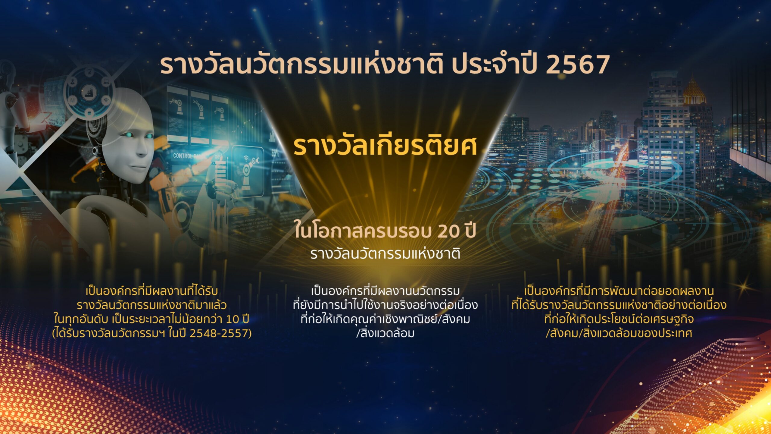 “การจัดงานรางวัลนวัตกรรมแห่งชาติในทุกปี นอกจากจะเป็นเวทีเพื่อประกาศเกียรติยศแก่นวัตกรไทยแล้ว ยังมีจุดมุ่งหมายสำคัญในการสร้างระบบนิเวศนวัตกรรมที่เข้มแข็งและยั่งยืนสำหรับประเทศไทย ด้วยการพัฒนาศักยภาพและต่อยอดผลงานนวัตกรรมของผู้ชนะเลิศผ่านกิจกรรมการให้คำปรึกษาและการสนับสนุนด้านนโยบาย เทคโนโลยี และธุรกิจ รวมถึงการสร้างแรงบันดาลใจแก่สังคมผ่านการเผยแพร่ผลงานในรูปแบบต่าง ๆ ซึ่งในปีนี้ จะเป็นอีกปีเราจะได้เห็นความยิ่งใหญ่ของศักยภาพนวัตกรรมจากคนไทย ผ่านผลงานชิ้นสำคัญที่จะเข้าชิงในรางวัลนวัตกรรมแห่งชาติทั้ง 5 ด้าน ได้แก่ ด้านเศรษฐกิจ ด้านสังคมและสิ่งแวดล้อม ด้านผู้สื่อสารนวัตกรรม ด้านองค์กรนวัตกรรมดีเด่น และรางวัลเกียรติยศ ซึ่งแน่นอนว่าผลงานที่ชนะเลิศรางวัลนี้จะเป็นผลงานที่แสดงถึงจุดสูงสุดของนวัตกรรมไทยในรอบ 20 ปี”