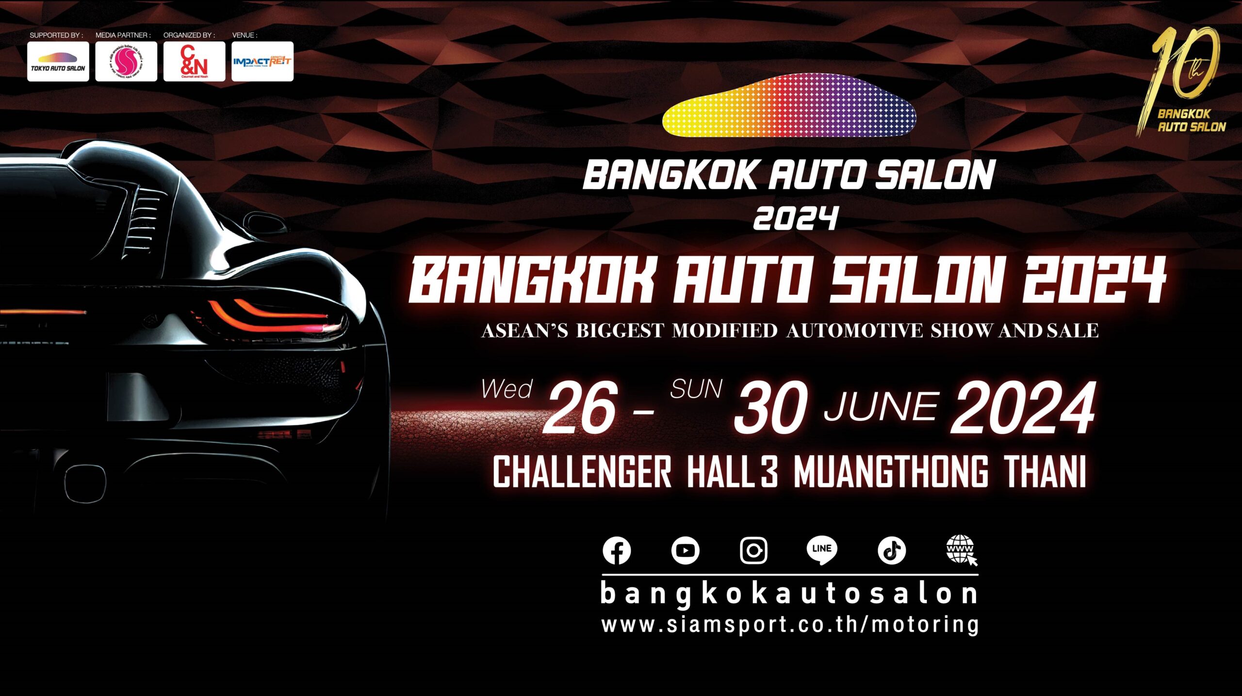 เตรียมตัวให้พร้อมกับงานเฟสติวัลสุดมันส์แห่งปี ‘แบงค็อก ออโต ซาลอน 2024’ ครั้งที่ 10 จัดโดย บริษัท คอร์โน แอนด์ แนช จำกัด โดยได้รับลิขสิทธิ์จากผู้จัดงานโตเกียว ออโต ซาลอน บริษัท ซัง-เอ คอร์ปอเรชั่น ญี่ปุ่น ด้วยรูปแบบงานที่โดดเด่นและพัฒนาให้ตอบโจทย์ทุกภาคส่วนจนได้รับการยอมรับ ว่าเป็นมหกรรมยานยนต์และอุปกรณ์แต่งรถยิ่งใหญ่ที่สุดในอาเซียน นี่คือโอกาสพิเศษที่จะได้สัมผัสกับปรากฏการณ์ทางวัฒนธรรมยานยนต์และร่วมเป็นส่วนหนึ่งในการขับเคลื่อนอุตสาหกรรมยานยนต์ไทย สู่ระดับโลก กำหนดจัดแสดง วันพุธที่ 26 – วันอาทิตย์ที่ 30 มิถุนายน 2567 ณ อาคารชาเลนเจอร์ ฮอลล์ 3 อิมแพ็ค เมืองทองธานี จัดแสดงงานเวลา 12.00-21.30 น.ในวันจันทร์-ศุกร์ และเวลา 11.00-21.30 น. ในวันเสาร์-อาทิตย์ บัตรเข้าชมงานจำหน่ายบัตรราคา 100 บาท