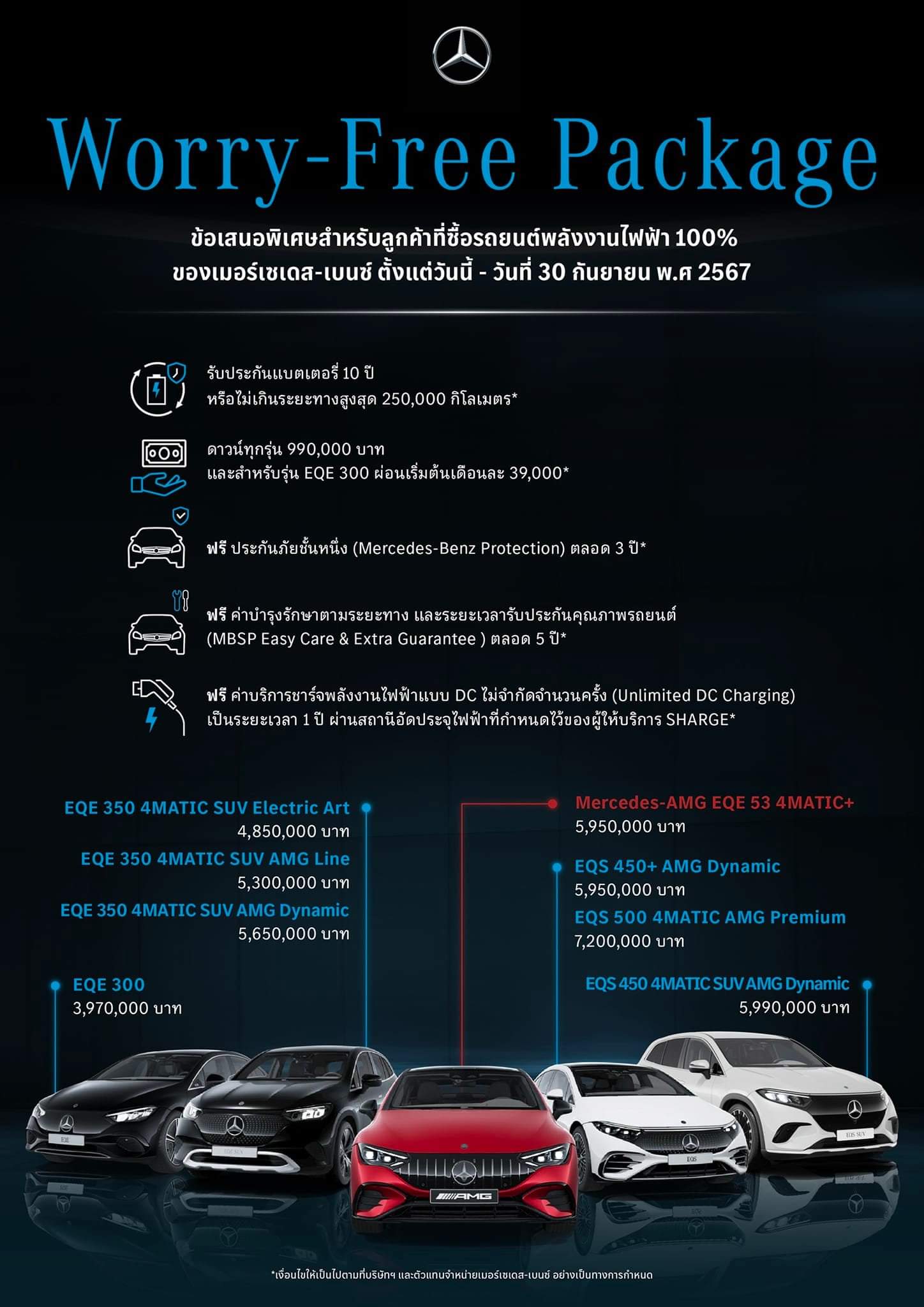 EQE 300 และ EQS 450 4MATIC SUV AMG Dynamic จะมาพร้อมการรับประกันแบตเตอรี่ที่ครอบคลุมการใช้งานตลอดระยะเวลา 10 ปี หรือไม่เกิน 250,000 กิโลเมตร* รวมถึงแพ็คเกจ “Worry Free”กับข้อเสนอที่มอบให้กับลูกค้าที่ซื้อรถยนต์พลังงานไฟฟ้า 100% ของเมอร์เซเดส-เบนซ์ โดยมีรายละเอียด ดังนี้