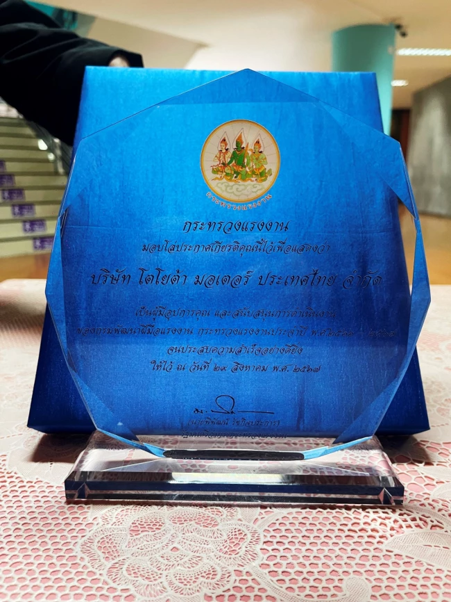 บริษัท โตโยต้า มอเตอร์ ประเทศไทย จำกัด รับมอบโล่ประกาศเกียรติคุณเครือข่ายพัฒนาฝีมือแรงงาน จาก นายพิพัฒน์ รัชกิจประการ รัฐมนตรีว่าการกระทรวงแรงงาน เมื่อวันที่ 29 สิงหาคม 2567 ณ ห้องประชุมจอมพล ป. พิบูลสงคราม ชั้น 5 อาคารกระทรวงแรงงาน