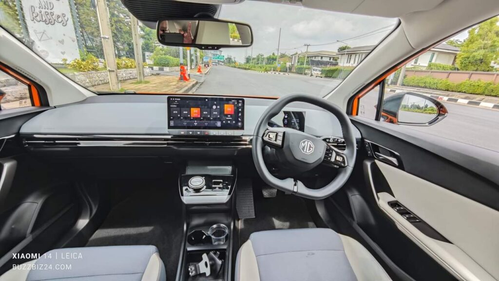 MG 4 รุ่นที่ Buzzbiz24 นำมาทดสอบเป็นรุ่น STANDARD RANGE (D) รูปร่างหน้าตาโดดเด่น สไตล์ICONIC EXTERIOR DESIGN ออกแบบรูปทรงตัวถังแบบ AERO DYNAMIC เพื่อเสริมสมรรถนะในการขับขี่ โดดเด่นตั้งแต่ไฟหน้า LED GALAXY TECHNOLOGY MATRIX พร้อม DAYTIME RUNNING LIGHTS โฉบเฉี่ยวเต็มอารมณ์ รุ่นนี้เน้นความเรียบง่าย ไม่มีอุปกรณ์ตกแต่งเสริมความหล่อเท่มากมาย แต่ก็ให้ล้ออัลลอยขนาด 17 นิ้ว พร้อม AERO WHEEL COVER แต่หากเป็น รุ่น LONG RANGE และ XPOWER จะเพิ่มหลังคาแบบ 2-TONE พร้อมสปอยเลอร์หลัง TWIN AERO WING เพิ่มทัศนวิสัยด้วยไฟท้าย LED และเสริมความสปอร์ตด้วยล้ออัลลอยลายใหม่ขนาด 18 นิ้ว