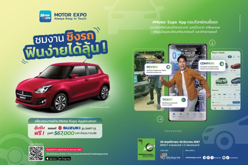 ยิ่งกว่านั้น ดาวน์โหลด MOTOR EXPO APP ทั้งระบบ iOS และ Android รับสิทธิ์ร่วมกิจกรรม “ชมงานผ่าน MOTOR EXPO APP ชิงรางวัล” รถยนต์ SUZUKI รุ่น SWIFT GL มูลค่า 567,000 บาท จำนวน 1 รางวัล ตั้งแต่วันที่ 15 พฤศจิกายน–31 ธันวาคม 2567