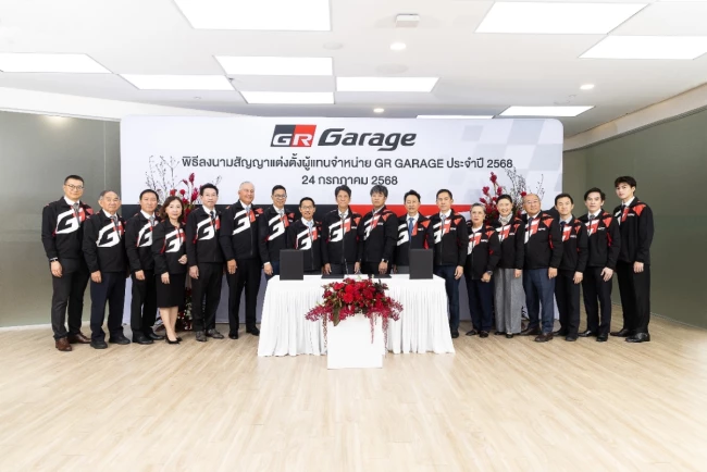 มร. โนริอากิ ยามาชิตะ กรรมการผู้จัดการใหญ่ บริษัท โตโยต้า มอเตอร์ ประเทศไทย จำกัด พร้อมด้วยตัวแทนจากผู้แทนจำหน่ายโตโยต้า ประกอบด้วย คุณพิเทพ จันทรเสรีกุล บริษัท โตโยต้า กรุงไทย จำกัด คุณจิรเดช สมภพรุ่งโรจน์ บริษัท โตโยต้า เค.มอเตอร์ส ผู้จำหน่ายโตโยต้า จำกัด คุณสุชาวดี ประโยชน์อมร ภาณุประภา พร้อมด้วย คุณคาร์ล ออพเพนบอร์น บริษัท โตโยต้า ธนบุรี จำกัด คุณเรืองชัย จิตรสกุล บริษัท โตโยต้าริช จำกัด คุณกมลพงศ์ สงวนตระกูล บริษัท โตโยต้าขอนแก่น ผู้จำหน่ายโตโยต้า จำกัด และ คุณชัยภัทร ณ ระนอง บริษัท โตโยต้าเพิร์ล ผู้จำหน่ายโตโยต้า จำกัด ร่วมเป็นเกียรติในพิธีลงนามสัญญาแต่งตั้งผู้แทนจำหน่าย GR GARAGE ประจำปี 2568 เมื่อวันที่ 24 กรกฎาคม 2568 ณ TOYOTA ALIVE ถนนบางนา-ตราด กม.3