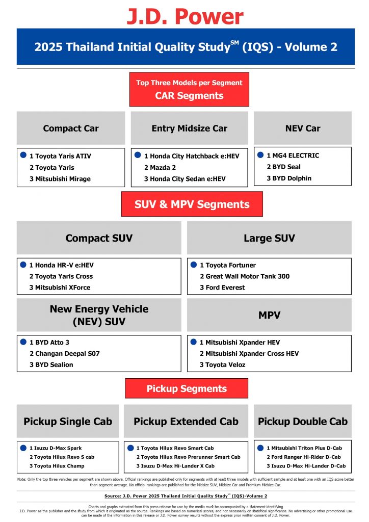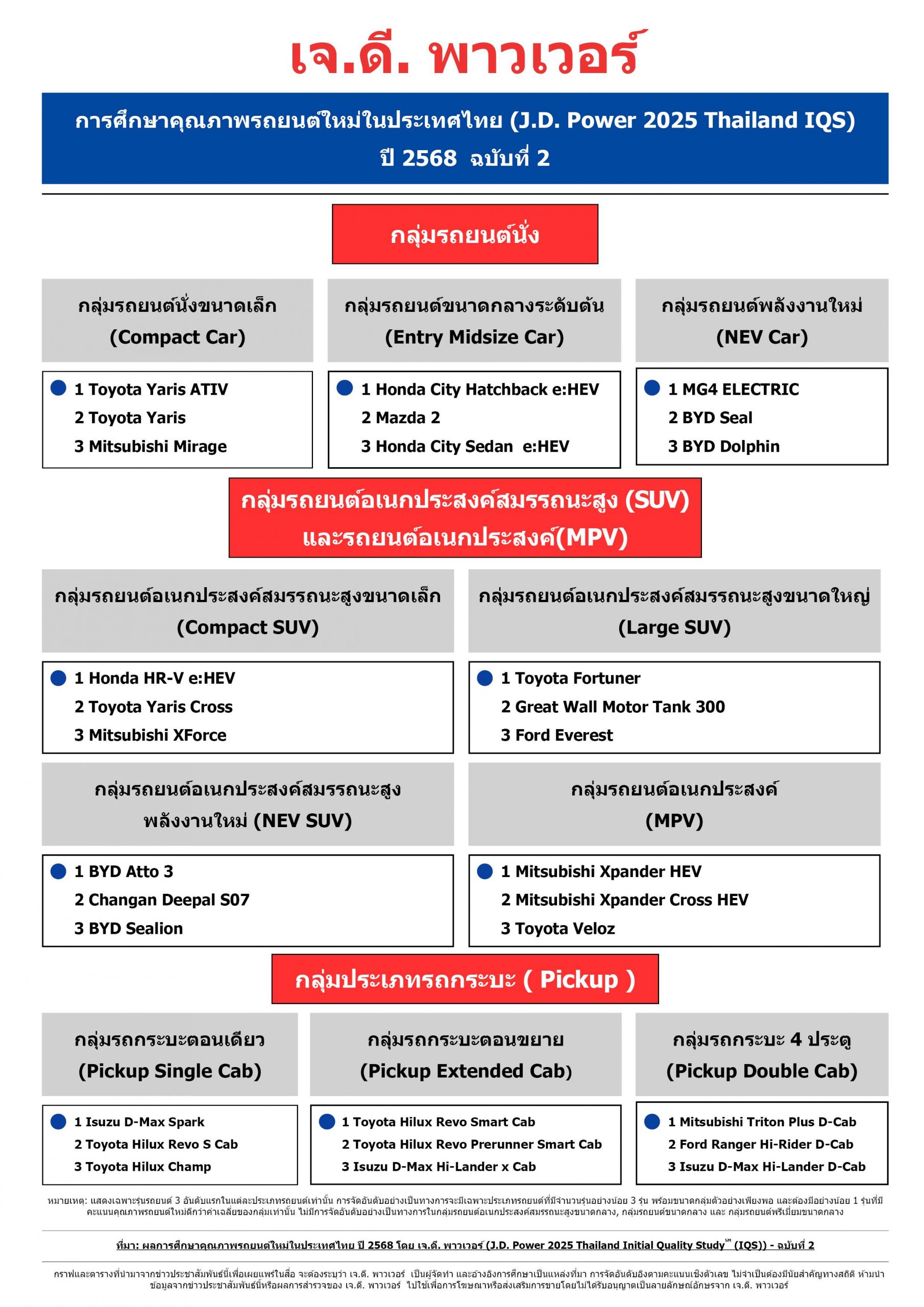 เจ.ดี.พาวเวอร์ เผยผลการศึกษาคุณภาพรถยนต์ใหม่ในประเทศไทย ประจำปี 2568 (J.D. Power 2025 Thailand Initial Quality StudySM (IQS)) ในกลุ่มเจ้าของรถใหม่จำนวน 4,832 ราย ซึ่งซื้อรถระหว่างเดือนมกราคมถึงกันยายน 2568 โดยทำการสำรวจภาคสนามระหว่างเดือนมิถุนายนถึงตุลาคม 2568 ใน 22 เมืองใหญ่ทั่วประเทศไทย ครอบคลุมรถยนต์ 57 รุ่นจาก 15 แบรนด์ โดยจัดอันดับจากจำนวนปัญหาต่อรถยนต์ 100 คัน (PP100) ซึ่งคะแนนปัญหาน้อยแสดงถึงคุณภาพที่ดีกว่า