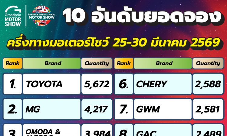 10 อันดับแบรนด์ที่มียอดจองสูงสุดภายในงานบางกอก อินเตอร์เนชั่นแนล มอเตอร์โชว์ ครั้งที่ 47
