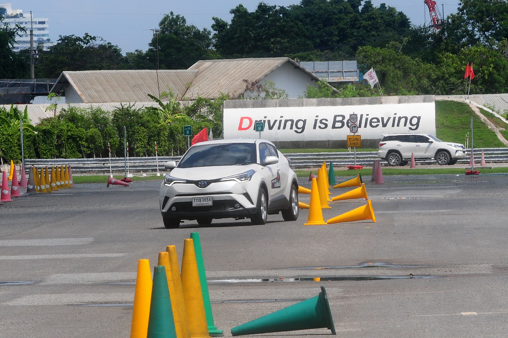 โดยหลังจากเสร็จสิ้นภาคทฤษฎีแล้ว ก็เข้าสู่ช่วงของการปฏิบัติจริง เริ่มตั้งแต่การสลาลอม ซึ่งการจับพวงมาลัยที่ถูกต้อง ทำให้ผู้ขับรถผ่านไพลอนที่ตั้งห่างกันเป็นระยะไปได้แบบสบายๆ ต่อมาด้วยการจำลองสถานการณ์ถนนลื่นแล้วเบรกรถอย่างกระทันหันพร้อมทั้งหักหลบสิ่งกีดขวาง ซึ่งเทคโนโลยีระบบเบรก ABS ที่ติดมากับรถโตโยต้าทุกคันจะเป็นตัวช่วยให้สามารถหักหลบสิ่งกีดขวางไปได้ ต่อไปที่การควบคุมรถในโค้ง โดยให้ผู้ปฏิบัติได้เข้าใจอาการของรถ และการถ่ายเทน้ำหนักของรถ ซึ่งจะมีผลกับการควบคุมรถทั้งแบบหน้าดื้อเลี้ยวไม่เข้า (อันเดอร์สเตียร์) หรือท้ายปัดระหว่างเลี้ยวโค้ง (โอเวอร์สเตียร์) ซึ่งสถานีนี้โตโยต้า ซี-เอชอาร์ ซึ่งมีระบบป้องกันล้อหมุนฟรี TRC (Traction Control System) ก็สามารถตอบสนองการเลี้ยวได้อย่างมีประสิทธิภาพ