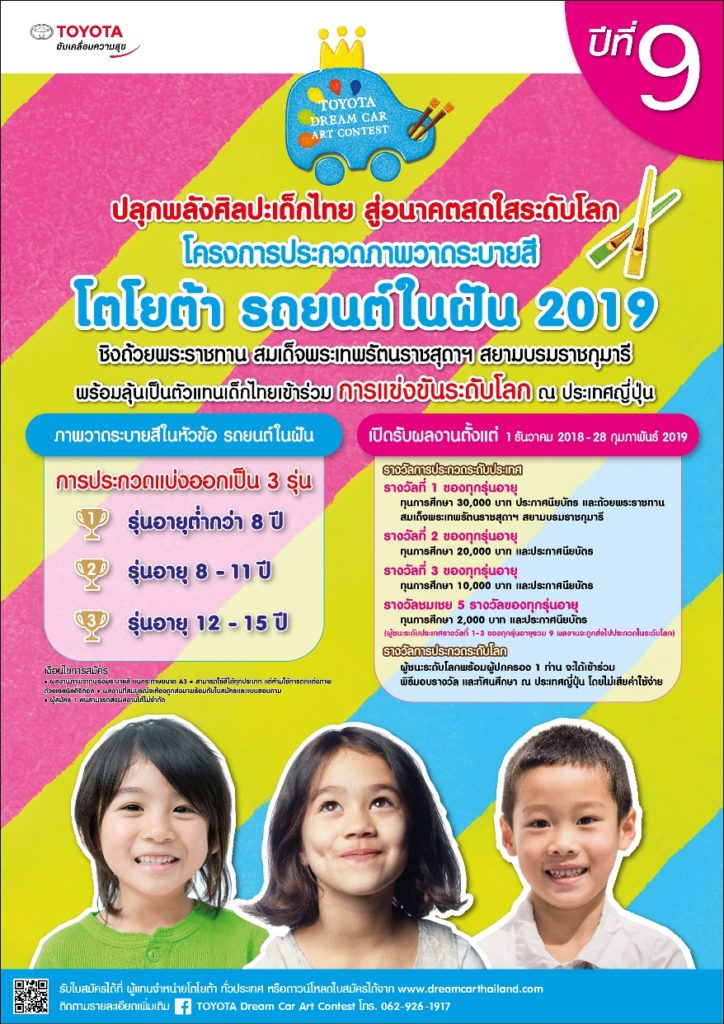 บริษัท โตโยต้า มอเตอร์ ประเทศไทย จำกัด เดินหน้าสานฝันปลุกพลังแห่งความคิดสร้างสรรค์ให้กับสังคมไทย ผ่านกิจกรรมการประกวดภาพวาดระบายสีในหัวข้อโตโยต้า รถยนต์ในฝัน “TOYOTA Dream Car Art Contest 2019” เป็นปีที่ 9 ภายใต้แนวคิด “ปลุกพลังศิลปะเด็กไทย สู่อนาคตสดใสระดับโลก” เพื่อส่งเสริมเยาวชนไทยให้มีช่องทางในการแสดงออกทางความคิดสร้างสรรค์และเพิ่มทักษะการวาดภาพผ่านผลงานศิลปะ ตลอดจนเป็นการสนับสนุนความสามารถของเด็กไทยให้ก้าวไกลสู่เวทีระดับโลก โดยเริ่มรับสมัครระหว่างวันที่ 1 ธันวาคม 2561 – 28 กุมภาพันธ์ 2562