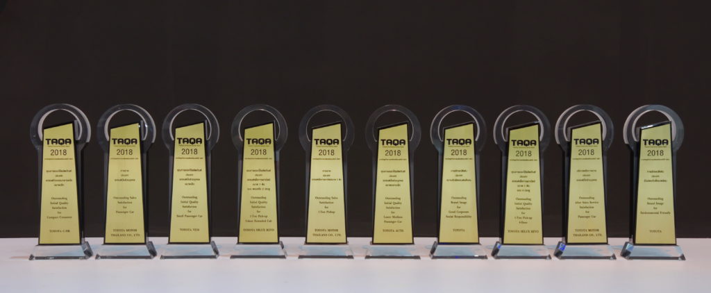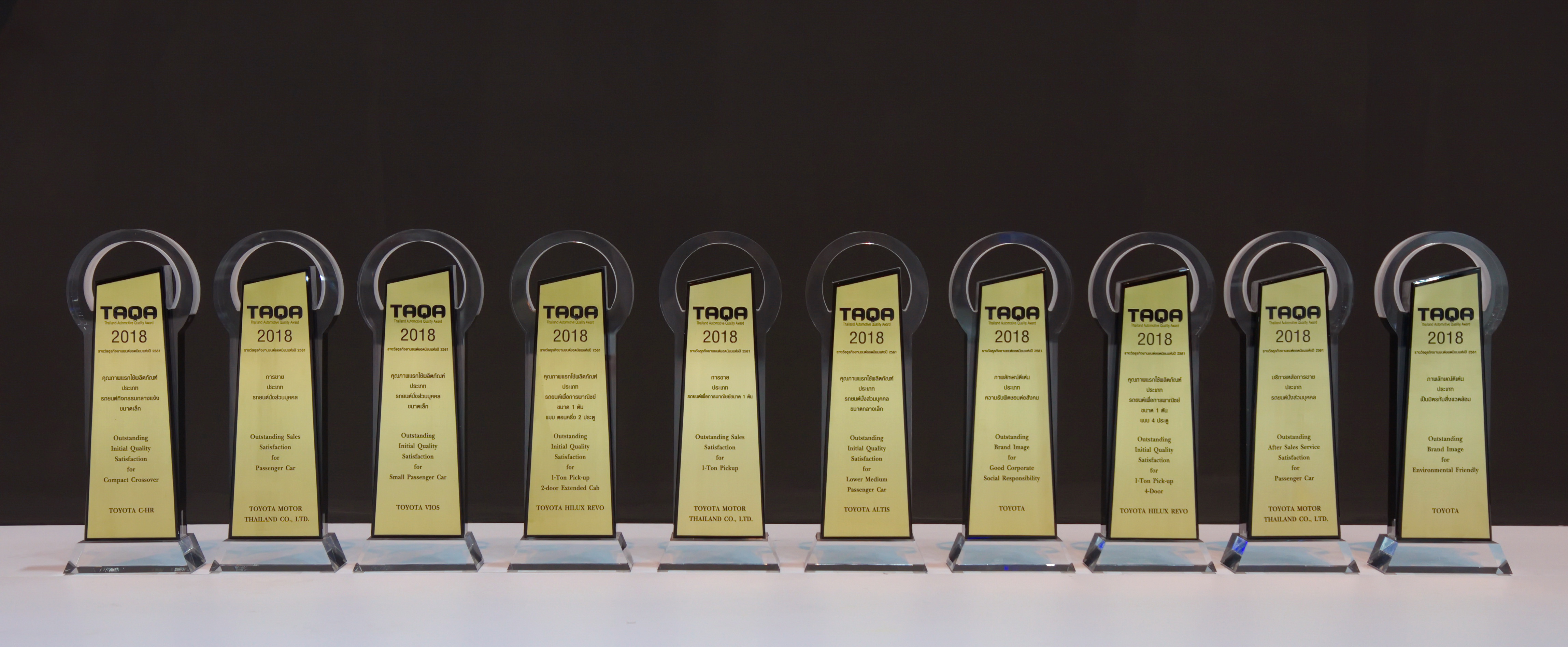 นายสุรภูมิ อุดมวงศ์ผู้ช่วยกรรมการผู้จัดการใหญ่ พร้อมด้วยคณะผู้บริหารระดับสูง บริษัทโตโยต้า มอเตอร์ ประเทศไทย จำกัด ร่วมรับรางวัล“ธุรกิจยานยนต์ยอดนิยมแห่งปี 2561” หรือ TAQA: Thailand Automotive Quality Award 2018จากดร. สมชาย หาญหิรัญ รัฐมนตรีช่วยว่าการกระทรวงอุตสาหกรรม เมื่อวันที่ 7ธันวาคมที่ผ่านมาณอาคารชาเลนเจอร์ฮอลล์อิมแพ็คเมืองทองธานี โดยรางวัลที่ได้รับในครั้งนี้ มีดังนี้
