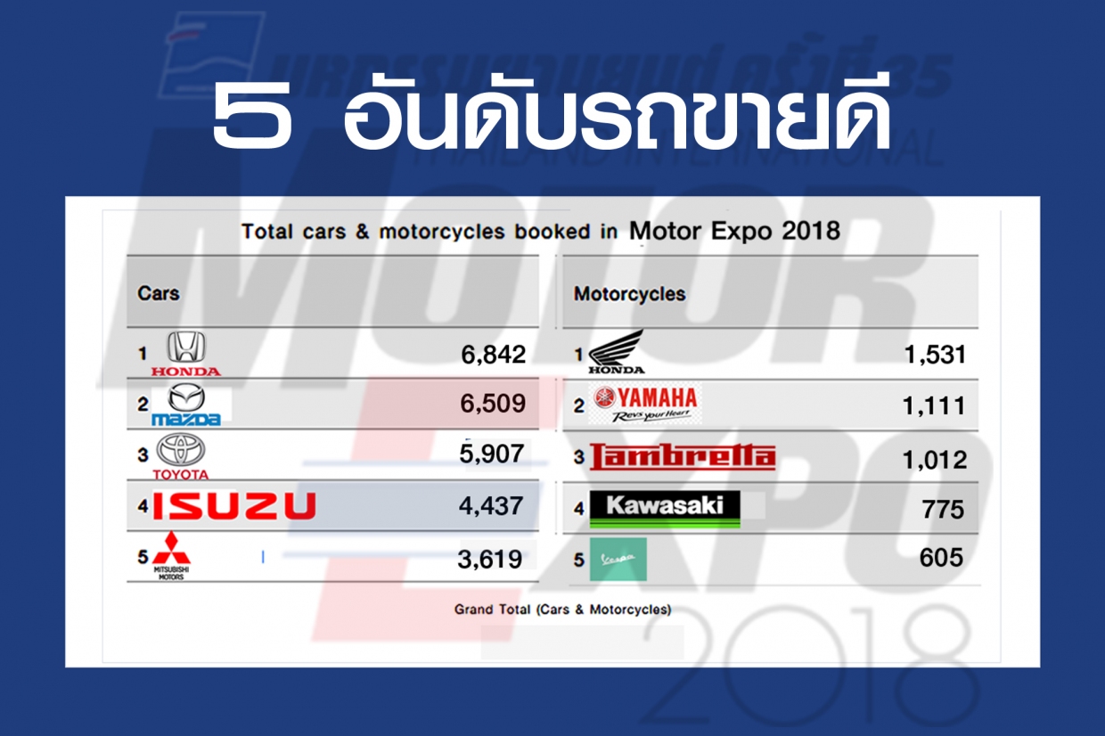 สำหรับยอดจองรถยนต์จาก 36 ผู้ผลิต มีจำนวนทั้งสิ้น 44,189 คัน เพิ่มขึ้นจากปีก่อน 10.9 % โดย 5 อันดับสูงสุดได้แก่ อันดับ 1 ฮอนด้า 6,842 คัน อันดับ 2 มาสด้า 6,509 คัน อันดับ 3 โตโยต้า 5,907 คัน อันดับ 4 อีซูซุ 4,437 คัน และอันดับ 5 มิตซูบิชิ 3,619 คัน
