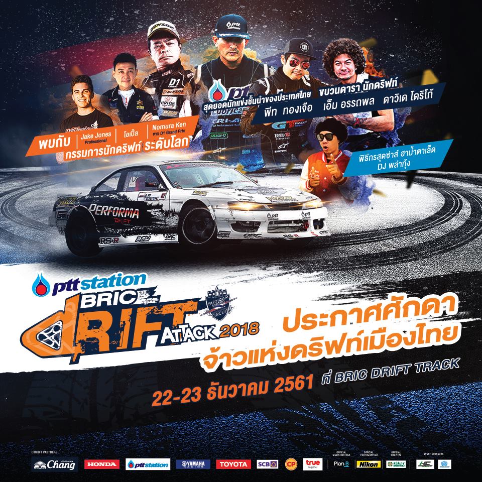 การแข่งขัน “พีทีที สเตชั่น บีอาร์ไอซี ดริฟต์แอ็ทแท็ค2018” จัดขึ้นต่อเนื่องเป็นปีที่ 4 มีคิวดวลลีลากันในสนามสุดท้ายของปีเพื่อตัดสินแชมป์หาดริฟต์ก๊อดของไทยในระหว่างวันเสาร์-อาทิตย์ที่ 22-23 ธันวาคมนี้ ที่ ดริฟต์แทร็ก สนามช้าง อินเตอร์เนชั่นแนลเซอร์กิตจ.บุรีรัมย์ ซึ่งถือเป็นหนึ่งในสนามดริฟต์ที่สวยงามและครบครันที่สุดแห่งหนึ่งของเอเชีย ภายใต้การตัดสินของกรรมการที่เป็นนักดริฟต์อันดับต้นๆของโลกอย่าง โนมูระ เคน ยอดนักดริฟต์ชาวญี่ปุ่น และ เจคโจนส์ดริฟต์ก๊อดชาวออสเตรเลียน