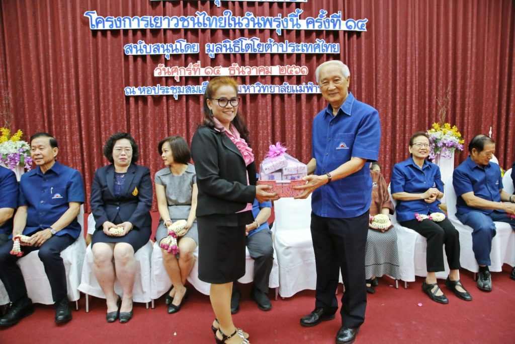 นายประมนต์ สุธีวงศ์ ประธานมูลนิธิโตโยต้าประเทศไทย พร้อมด้วย รศ.ดร. วันชัย ศิริชนะ อธิการบดีมหาวิทยาลัยแม่ฟ้าหลวง ดร.วิลาวัณย์ จำปาแก้ว ผู้อำนวยการโครงการเยาวชนไทยวันพรุ่งนี้ ร่วมเป็นประธานในพิธีมอบทุนการศึกษาประจำปี 2561 จำนวน 250 ทุน รวมมูลค่า 1,430,000 บาท เพื่อสร้างโอกาสทางการศึกษาและพัฒนาคุณภาพชีวิต แก่นักเรียนและนักศึกษาที่ขาดแคลนทุนทรัพย์ในภาคเหนือ โดยได้รับเกียรติจากคณะกรรมการมูลนิธิโตโยต้าฯ ร่วมเป็นสักขีพยาน เมื่อวันศุกร์ที่ 14 ธันวาคม พ.ศ. 2561 ณ หอประชุมสมเด็จย่า อาคาร C4 มหาวิทยาลัยแม่ฟ้าหลวง จ.เชียงราย