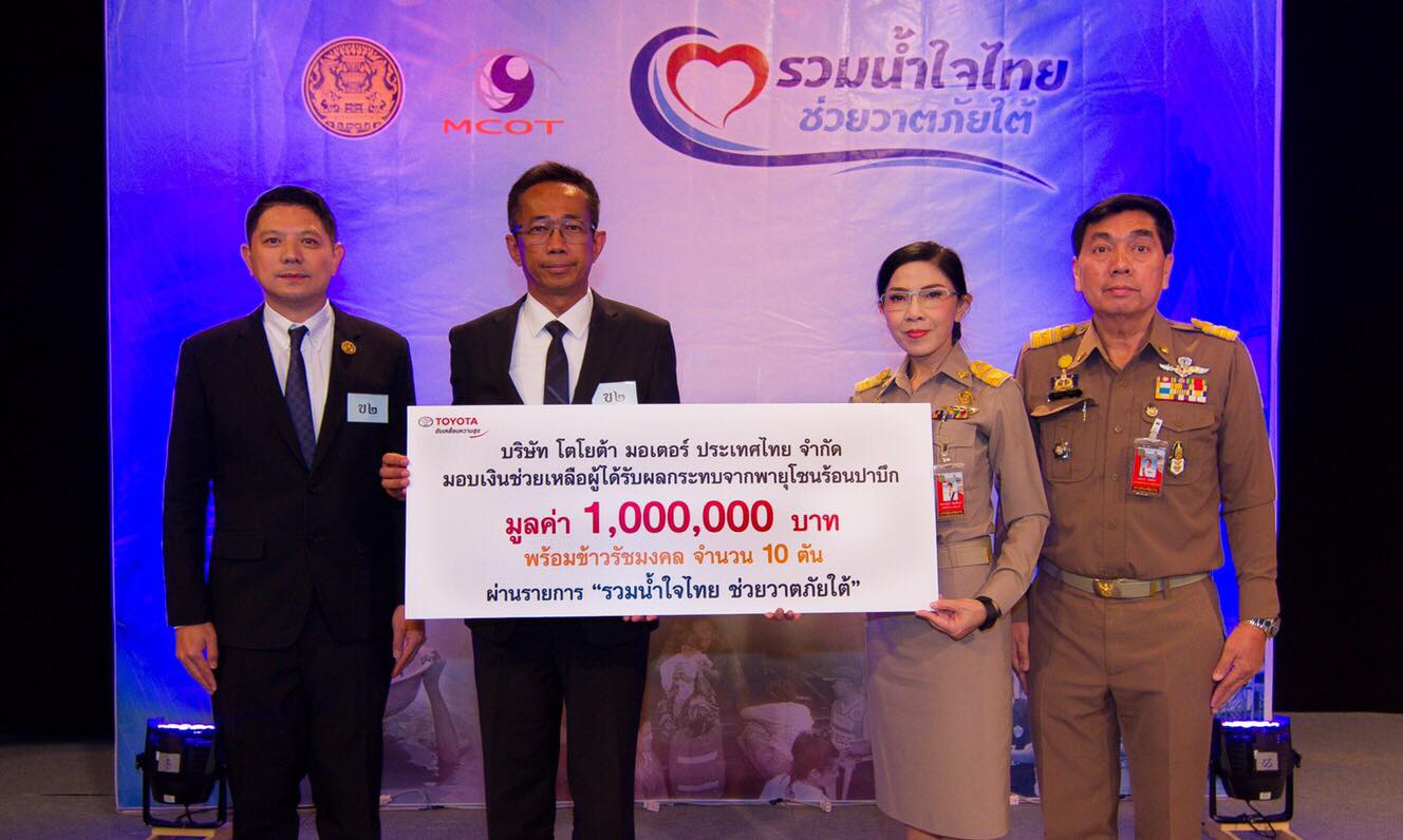นายรุ่งโรจน์ ขันชะลี ผู้ช่วยกรรมการผู้จัดการใหญ่ บริษัท โตโยต้า มอเตอร์ ประเทศไทย จำกัดเป็นตัวแทนมอบเงินช่วยเหลือ จำนวน 1ล้านบาท พร้อมข้าวรัชมงคลจำนวน 10 ตัน รวมมูลค่ากว่า 1.2 ล้านบาท แก่ “กองทุนเงินช่วยเหลือผู้ประสบสาธารณภัย สำนักนายกรัฐมนตรี” ผ่านรายการ “รวมน้ำใจไทย ช่วยวาตภัยใต้”เพื่อร่วมสนับสนุนกิจกรรมในการบรรเทาทุกข์แก่พี่น้องผู้ได้รับผลกระทบจากพายุโซนร้อน “ปาบึก”ที่สร้างผลกระทบต่อบ้านเรือน และระบบสาธารณูปโภค ตลอดจนเพื่อช่วยฟื้นฟูชีวิตความเป็นอยู่ของผู้ประสบภัยภาคใต้ ให้กลับเข้าสู่สภาวะปกติโดยเร็วโดยมีนางพัชราพรณ์ อินทรียงค์ ปลัดสำนักนายกรัฐมนตรี เป็นผู้รับมอบ ในวันที่ 7 มกราคม 2562 ณ ห้องส่ง อาคาร 5 อาคารปฏิบัติการ บมจ. อสมท.