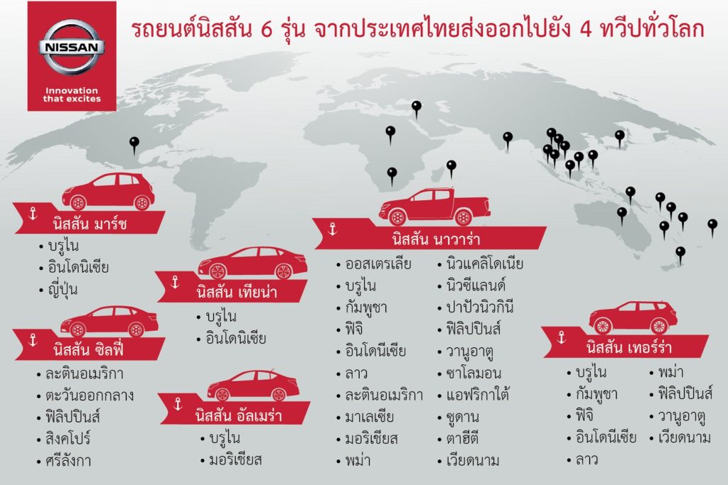 ในปีที่ผ่านมาตลาดส่งออกสูงสุด 3 อันดับแรกของนิสสันประเทศไทยได้แก่ฟิลิปปินส์ ออสเตรเลีย และญี่ปุ่น ตามด้วยอินโดนีเซียมาเลเซีย แอฟริกาใต้ เวียดนาม นิวซีแลนด์ ดูไบและโอมาน