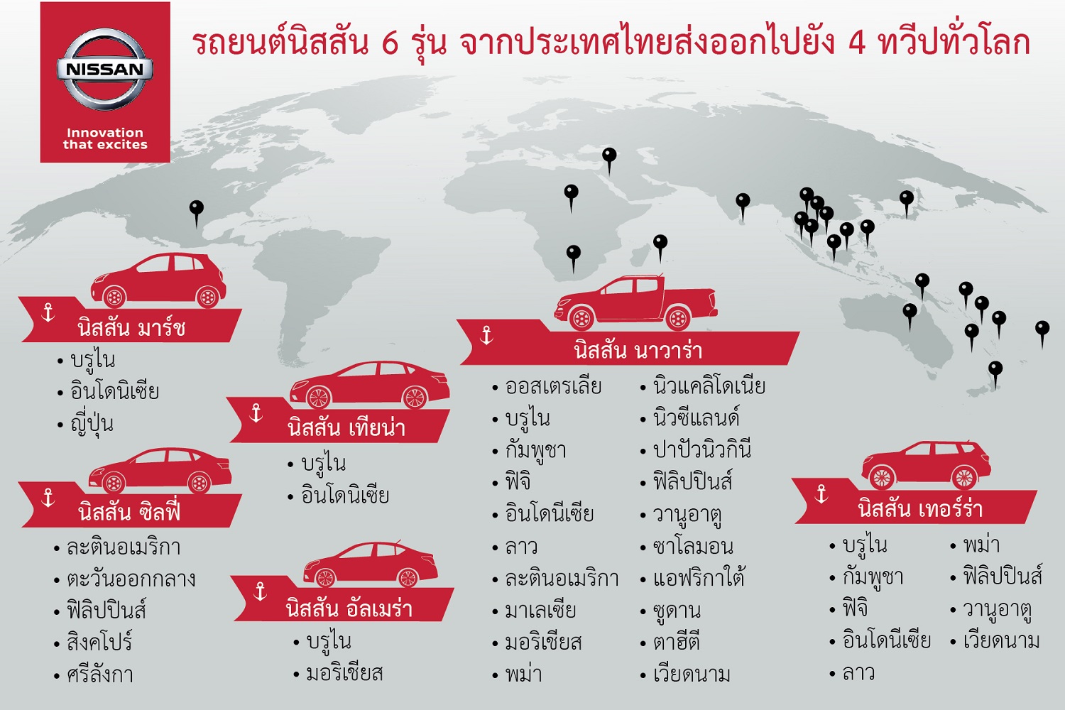 นิสสันประเทศไทย เริ่มทำการส่งออกรถยนต์คุณภาพสูงที่ผลิตขึ้นในประเทศไทยไปสู่ลูกค้าทั่วโลก นับตั้งแต่ปีพ.ศ.2542โดยนิสสันฟรอนเทียร์คือรถยนต์รุ่นแรกที่ถูกส่งออกไปยังประเทศออสเตรเลีย นับแต่นั้นเป็นต้นมาฐานการผลิตของนิสสัน ประเทศไทย ได้มีการขยายตัวเพื่อรองรับการเติบโตที่เพิ่มสูงขึ้นจนได้รับการยอมรับให้เป็นศูนย์กลางการผลิตสำคัญของนิสสันในภูมิภาคเอเชียและโอเชียเนีย ทำหน้าที่สำคัญในการผลิตรถยนต์คุณภาพส่งถึงมือลูกค้าผู้ขับขี่จากทั่วทุกมุมโลก