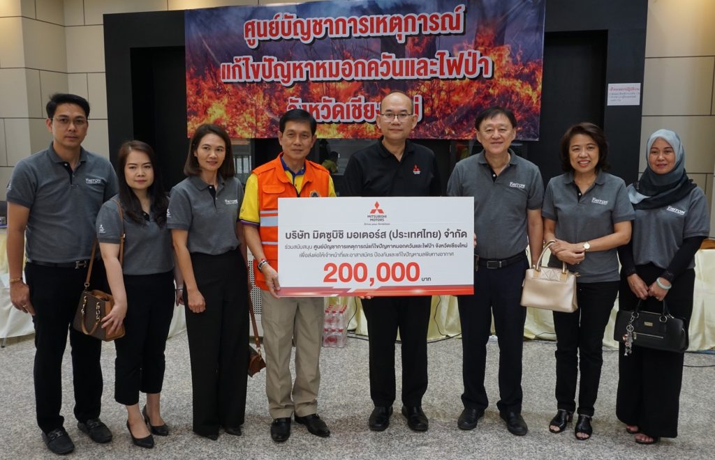 บริษัท มิตซูบิชิ มอเตอร์ส (ประเทศไทย) จำกัดมอบเงินบริจาครวม 400,000 บาท แก่ศูนย์บัญชาการเหตุการณ์แก้ไขปัญหาหมอกควันและไฟป่าจังหวัดเชียงใหม่และเชียงราย เพื่อร่วมบรรเทาวิกฤตการณ์ดังกล่าว โดยสนับสนุนการดำเนินงานของเจ้าหน้าที่และอาสาสมัครป้องกันและแก้ไขปัญหามลพิษทางอากาศซึ่งปฏิบัติการดับไฟป่าในหลายจุดของพื้นที่จังหวัดเชียงใหม่และเชียงรายที่เผชิญกับสถานการณ์ฝุ่นละอองเกินค่ามาตรฐาน