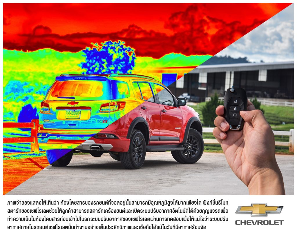 อย่างไรก็ตาม ลูกค้าเชฟโรเลตในประเทศไทยไม่จำเป็นต้องทนต่ออากาศที่ร้อนจัด เนื่องจากเทคโนโลยีรีโมทสตาร์ทในรถกระบะ โคโลราโด และรถอเนกประสงค์ เทรลเบลเซอร์ช่วยให้ผู้ใช้สามารถสตาร์ทเครื่องยนต์และเปิดระบบปรับอากาศเพื่อทำความเย็นในห้องโดยสารตามอุณหภูมิที่กำหนดไว้ล่วงหน้าด้วยกุญแจก่อนที่จะเข้าไปนั่งในรถยนต์ได้ ระบบปรับอากาศของเชฟโรเลตได้รับการออกแบบให้ทำความเย็นอยู่ในระดับที่สร้างความเย็นสบายในเวลาไม่กี่นาทีด้วยช่องแอร์ที่มีในทุกแถวที่นั่ง ลูกค้าเชฟโรเลตยังสามารถเปิดหน้าต่างทุกบานได้ด้วยกุญแจรถเพื่อการระบายอากาศที่รวดเร็วและทำให้ห้องโดยสารมีความเย็นเร็วทันใจกว่าเดิม