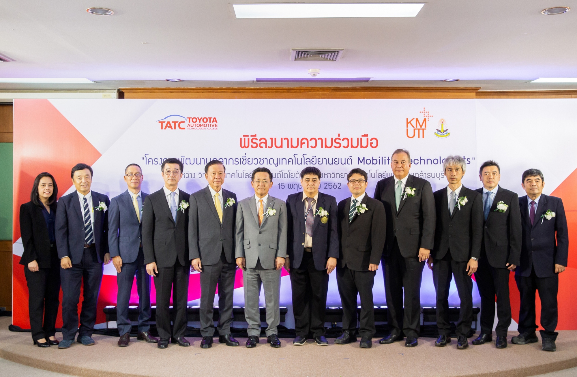 นายมิจิโนบุ ซึงาตะ กรรมการผู้จัดการใหญ่ บริษัท โตโยต้า มอเตอร์ ประเทศไทย จำกัด พร้อมด้วย ผู้ช่วยศาสตราจารย์ ดร.ภาณุทัต บุญประมุข รองอธิการบดีฝ่ายพัฒนาการศึกษามหาวิทยาลัยเทคโนโลยีพระจอมเกล้าธนบุรี นายวุฒิกร สุริยะฉันทนานนท์ รองกรรมการผู้จัดการใหญ่ และ นายศุภชัย สินสุวรรณรักษณ์ ผู้ช่วยกรรมการผู้จัดการใหญ่ บริษัท โตโยต้า มอเตอร์ ประเทศไทย จำกัด ร่วมในพิธีลงนามบันทึกความร่วมมือระหว่างวิทยาลัยเทคโนโลยียานยนต์ โตโยต้า และมหาวิทยาลัยเทคโนโลยีพระจอมเกล้าธนบุรี ในการดำเนินโครงการ “พัฒนาบุคลากรเชี่ยวชาญเทคโนโลยียานยนต์ Mobility Technologist” เพื่อสร้างบุคลากรที่มีความรอบรู้ในด้านเทคโนโลยียานยนต์และแนวคิดการบริหารการจัดการอย่างมีประสิทธิภาพ เมื่อวันพุธที่ 15 พฤษภาคม ที่ผ่านมา ณ สถาบันเทคโนโลยีพระจอมเกล้าธนบุรี