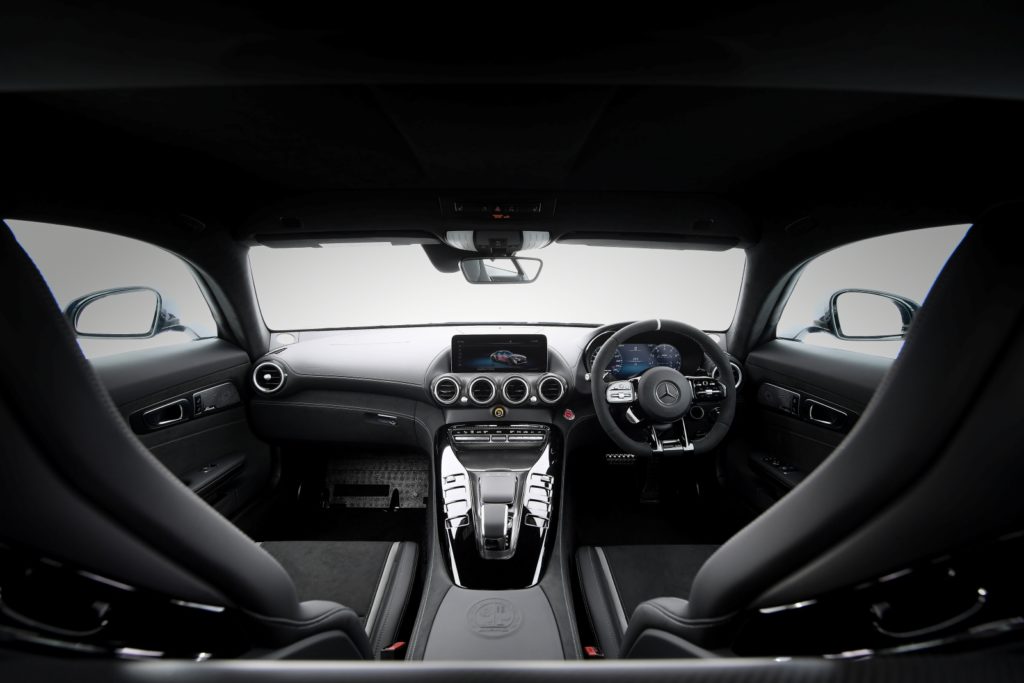 ดีไซน์ภายในห้องโดยสารของ Mercedes-AMG GT Rโฉมใหม่ มาพร้อมอุปกรณ์ตกแต่งดีไซน์ใหม่ในหลายจุด ซึ่งเป็นการออกแบบที่ได้รับอิทธิพลมาจากรถยนต์มอเตอร์สปอร์ต อาทิ เบาะที่นั่งที่ถูกปรับให้ต่ำลงเพื่อให้ผู้ขับขี่รู้สึกเป็นหนึ่งเดียวกับตัวรถ อีกทั้งยังเป็นเบาะที่นั่งแบบ AMG BucketSeats หุ้มด้วยหนัง Nappaและ DINAMICAMicrofibreที่ช่วยปกป้องลำตัวด้านข้างได้ดีแม้ขณะขับขี่ด้วยความเร็วสูง ทั้งนี้ ผู้เป็นเจ้าของสามารถเลือกติดตั้งเบาะที่นั่งแบบAMG Performance และอุปกรณ์เสริมต่างๆ เพื่อเพิ่มความเร้าอารมณ์ขณะขับขี่ เช่น ชุดเข็มขัดนิรภัยสีเหลือง หรือชุดแต่งห้องโดยสาร AMG Interior Piano Lacquerเป็นต้น,ชุดแต่ง AMG Interior Night เป็นชุดแต่งมาตรฐานของรถยนต์รุ่นนี้ มาพร้อมพวงมาลัยแบบ AMG Performance Steering ตกแต่งด้วย DINAMICA Microfiberสีดำ พร้อมหน้าจอแสดงผลบนพวงมาลัยจำนวน 2 หน้าจอแบบ AMG steering wheel buttonsลงตัวด้วยหน้าจอเรือนไมล์แบบall-digital instrument display ขนาด 12.3 นิ้ว และเกียร์จะชุบสีดำเงาทั้งหมด,แผงหน้าปัดกว้างดีไซน์ใหม่ด้วยอัตราส่วนแบบ 16:9ขนาด10.15 นิ้ว ทำงานด้วยระบบปฏิบัติการแบบ COMAND Onlineสื่อถึงเอกลักษณ์ของงานออกแบบอากาศยาน,แผงควบคุมตรงกลางมีหน้าจอแสดงผลมากถึง8จอบริเวณคอนโซลกลางแบบ AMG DRIVE UNIT ที่ออกแบบตามลักษณะเครื่องยนต์แบบ V8และมีช่องลมของเครื่องปรับอากาศ4 ช่องที่ดูคล้ายสปอตไลท์