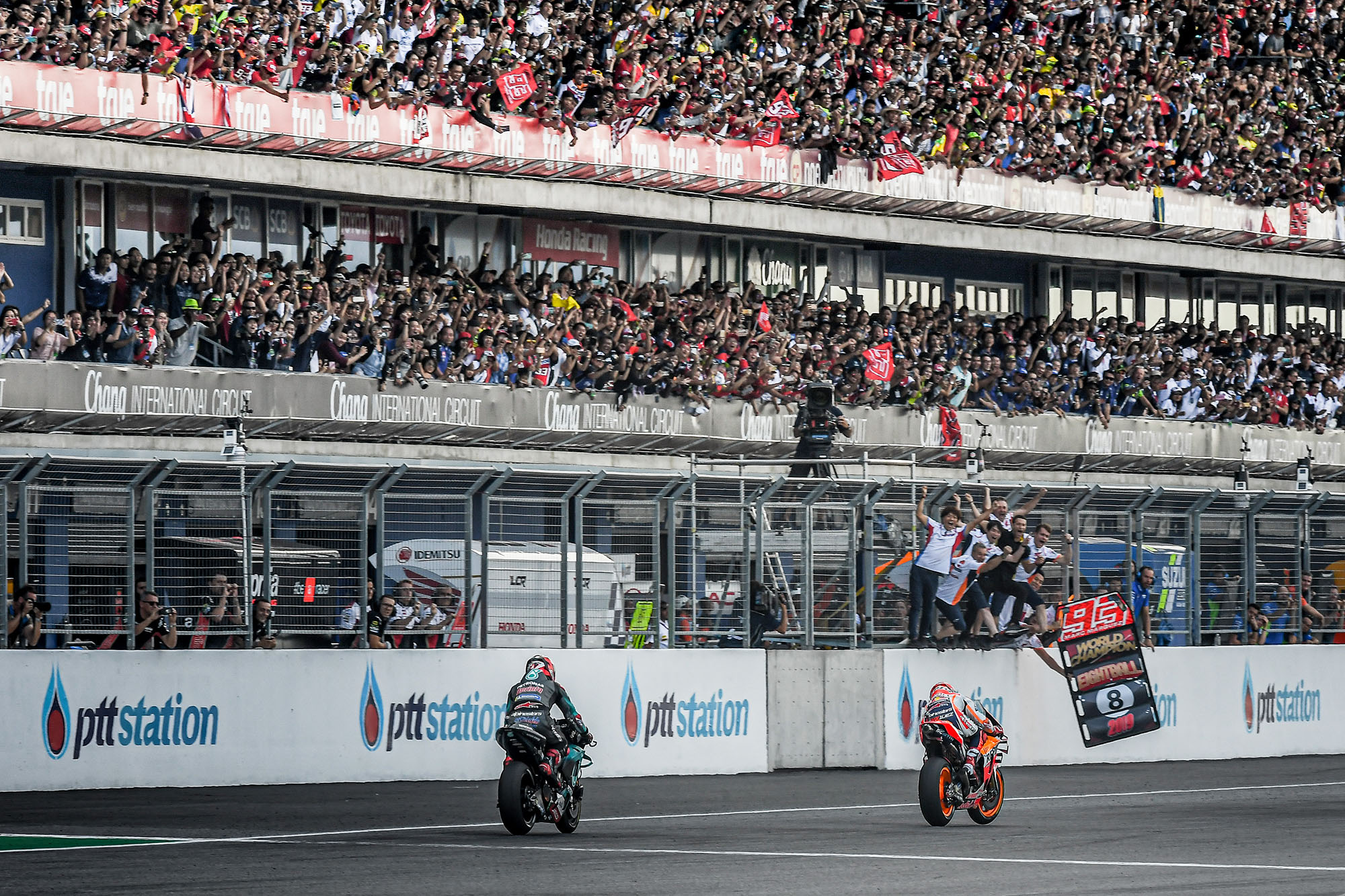 ภาพการฉลองแชมป์โลกสมัยที่ 8 อย่างยิ่งใหญ่ของ มาร์ค มาร์เกซ นักบิดชาวสแปนิช ที่ สนามช้าง อินเตอร์เนชั่นแนล เซอร์กิต ถูกตีแผ่ออกไปสู่สายตาแฟนความเร็วทั่วโลกกว่า 800 ล้านคู่ เป็นการนำเสนอความสำเร็จอันยิ่งใหญ่ของการเป็นเจ้าภาพ “โมโตจีพี” ครั้งที่ 2 ในเมืองไทย ขณะที่ตัวเลขด้านเศรษฐกิจเพิ่มขึ้นกว่า 25 เปอร์เซ็นต์ จากจำนวนผู้เข้าชม 226,655 คน สูงกว่าปีที่ผ่านมา สะท้อนให้เห็นว่า “พีทีที ไทยแลนด์ กรังด์ปรีซ์” ภายใต้ฝีมือคนไทยไม่เพียงนำไปสู่ความสำเร็จในด้านมอเตอร์สปอร์ต แต่ยังบ่งชี้ถึงการนำมาซึ่งเม็ดเงินมหาศาลหมุนเวียนในระบบเศรษฐกิจของไทย