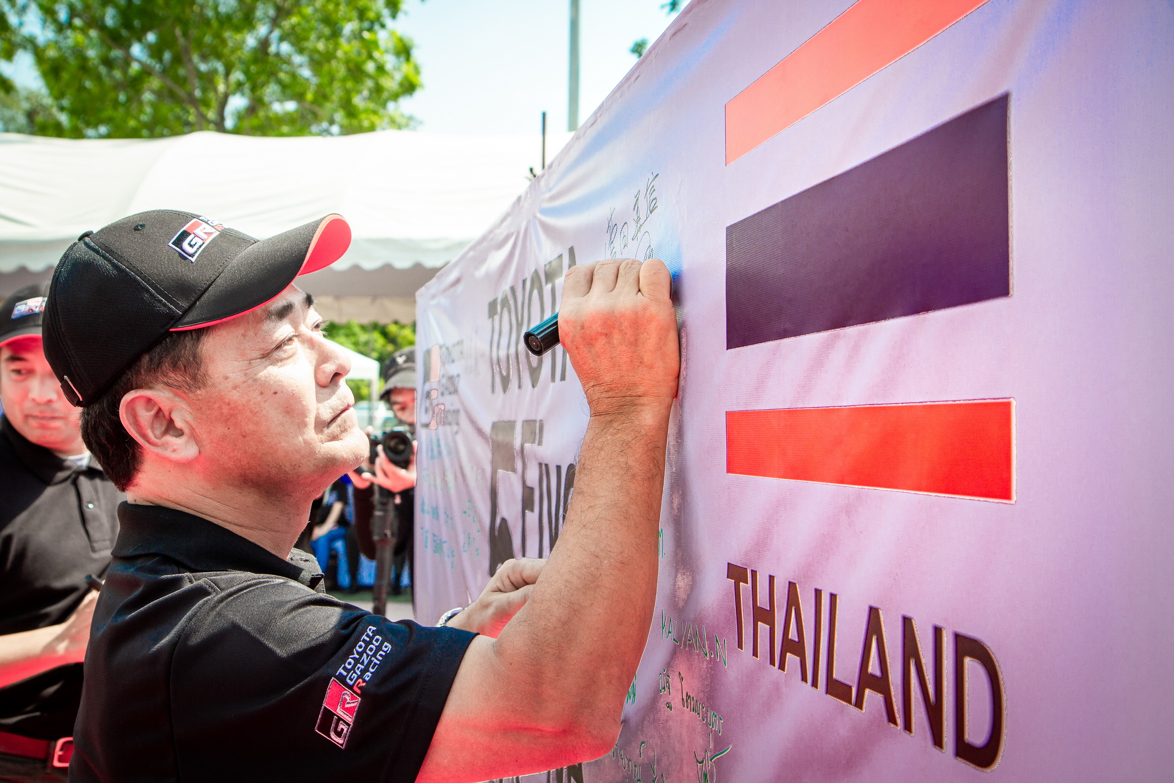 นายมิจิโนบุ ซึงาตะ ยังได้กล่าวปิดท้ายเพิ่มเติมว่า “ทุกท่านคงจะได้เห็นคำที่เขียนด้วยมือว่า “Smile” ที่อยู่บนหน้าต่างของรถไฮลักซ์ รีโว่ ซึ่งเซ็นโดย คุณอากิโอะ โตโยดะ กรรมการผู้จัดการใหญ่ บริษัท โตโยต้า มอเตอร์ คอร์ปอเรชั่น ประเทศญี่ปุ่น ผมเชื่อมั่นว่าสิ่งนี้จะเป็นกำลังใจให้ผู้ร่วมเดินทางทุกคนที่เดินทางขับรถในประเทศไทยหรือที่เรารู้จักกันดีว่า “ดินแดนแห่งรอยยิ้ม” ซึ่งคุณอากิโอะ โตโยดะ ได้บอกกับเราว่าที่มาของวิสัยทัศน์ขององค์กรระดับโลกที่ว่า “เราจะมุ่งมั่นนำเสนอในสิ่งที่เหนือความคาดหวังของลูกค้า เพื่อให้ได้มาซึ่งรอยยิ้ม” ได้รับแรงบันดาลใจมาจากประเทศไทยนั่นเอง”