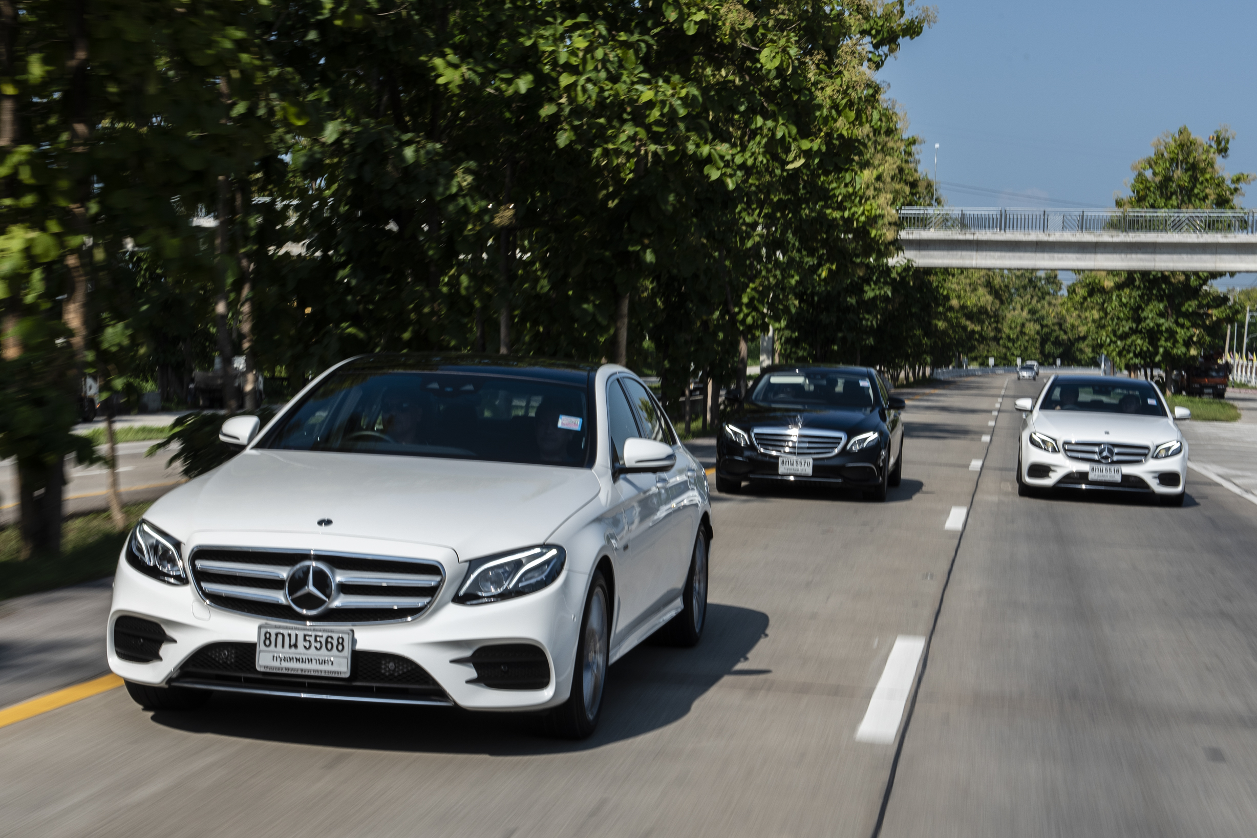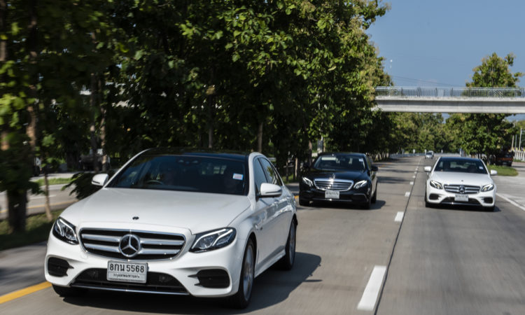 เช้าวันต่อมา MERCEDES-BENZ E 350 e ซีเคดี เทคโนโลยี EQ จอดเรียงรายที่ลานจอดรถสำหรับการเดินทางไกล โดยมีให้เลือก 3 แบบคือ Mercedes-Benz E 350 e Avantgardeราคา 3,540,000บาท Mercedes-Benz E 350 e Exclusive ราคา 3,790,000บาท และMercedes-Benz E 350 e AMG Dynamic ราคา 4,190,000บาท