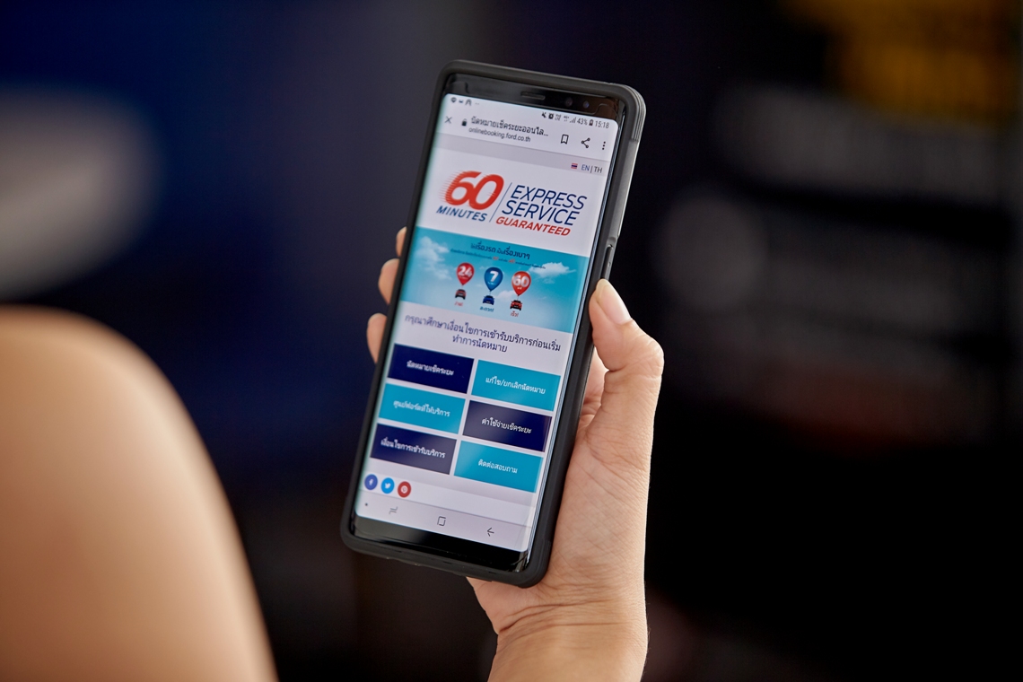 ฟอร์ดได้ริเริ่มให้บริการ60-Minute Express Service Guarantee Online Bookingเป็นครั้งแรกในประเทศไทยเมื่อปีพ.ศ.2559 บริการดังกล่าวได้รับการตอบรับที่ดีจากลูกค้าฟอร์ดอย่างต่อเนื่องเพราะช่วยอำนวยความสะดวกลดความยุ่งยากในการนัดหมายเข้ารับบริการเช็กระยะ โดยลูกค้าสามารถนัดหมายรับบริการเช็กระยะผ่านเว็บไซต์onlinebooking.ford.co.thได้ตลอด 24 ชั่วโมง และสามารถเข้ารับบริการที่ศูนย์บริการที่ลูกค้าสะดวกได้ตลอด 7 วันด้วยบริการนี้ฟอร์ดยังรับประกันเช็กระยะเสร็จภายใน 60 นาทีผ่านการนัดหมายแบบออนไลน์หากไม่สามารถให้บริการเสร็จได้ตามกำหนดลูกค้าจะได้รับบริการฟรี ปัจจุบัน60-Minute Express Service Guarantee Online Bookingมีให้บริการที่ศูนย์บริการ69แห่งทั่วประเทศและมีแผนจะขยายบริการไปยังศูนย์บริการ 90 แห่งทั่วประเทศภายในปี 2562