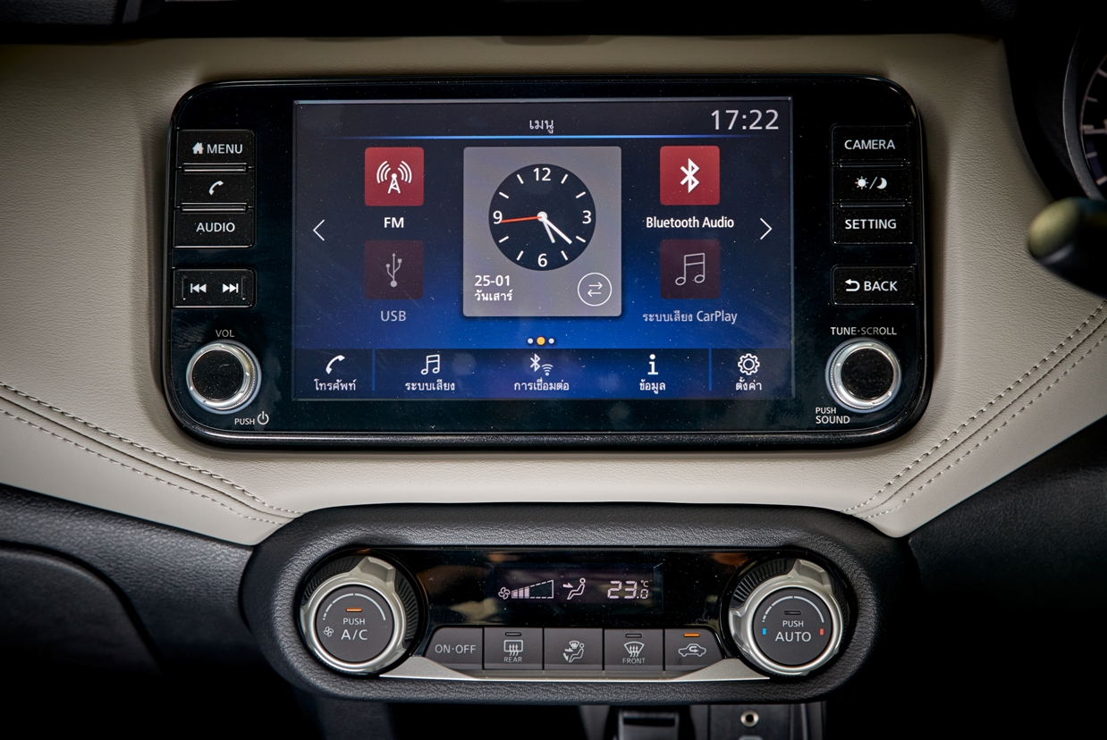 ระบบข้อมูลและความบันเทิง NissanConnect (ในรุ่นV และ VL) มาพร้อมหน้าจอสัมผัสขนาด 8 นิ้ว พร้อมช่องเชื่อมต่อ Bluetooth, USB และ AUX IN สำหรับอุปกรณ์ต่อพ่วง พร้อมลำโพงคุณภาพดี 6 จุด และระบบเชื่อมต่อโทรศัพท์สมาร์ทโฟนอย่าง Apple CarPlay