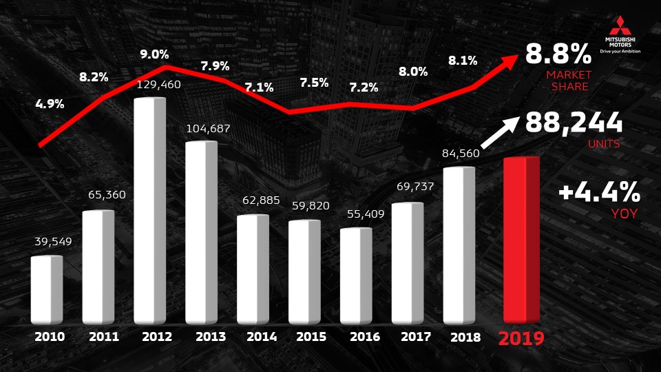 สำหรับยอดจำหน่ายรถยนต์ในปี 2562 เติบโตเพิ่มขึ้น 4.4 % เมื่อเทียบกับปีก่อนหน้าเป็นยอดจำหน่ายรวม 88,244 คัน มีส่วนแบ่งตลาดร้อยละ 8.8 % ผลการดำเนินงานของ มิตซูบิชิ มอเตอร์ส ประเทศไทย เติบโตสูงกว่าอุตสาหกรรมรถยนต์ในภาพรวม ซึ่งมียอดจำหน่ายรวมทั้งหมดที่ 1,007,552 คัน ลดลง 3.3% จากปี 2561