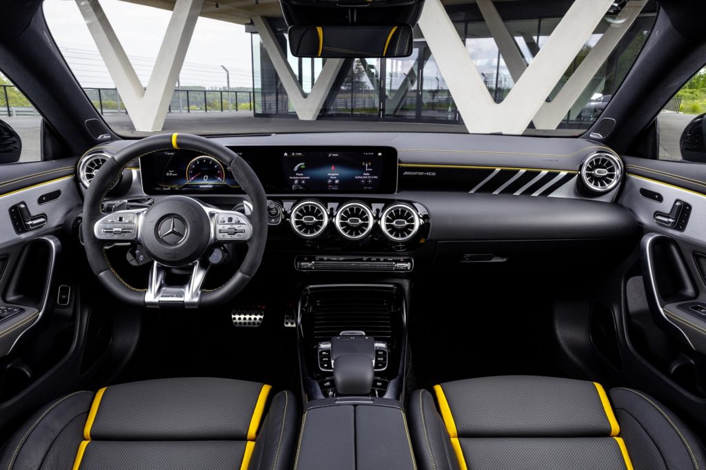 ส่วนดีไซน์ภายในเน้นความสปอร์ตสไตล์รถแข่งในทุกรายละเอียด เริ่มตั้งแต่เบาะนั่งแบบสปอร์ต AMG Sport seat ที่ให้ความรู้สึกราวกับเป็นนักแข่ง พร้อมการควบคุมพวงมาลัยแบบ AMG Performance steering wheel โดยปุ่มควบคุมบนพวงมาลัยยังจัดวางให้ใช้ง่ายเพื่อสมาธิในการขับขี่ที่ดีเยี่ยม มาพร้อมกับ AMG steering wheel buttons ตามแบบฉบับสไตล์นักแข่ง Formula 1 ที่สามารถเปลี่ยนโหมดการขับขี่ได้อย่างรวดเร็วเพียงปลายนิ้วสัมผัส พร้อมเพลิดเพลินไปกับหน้าจอแสดงผลขนาดใหญ่พิเศษ 2 จอต่อเนื่องของระบบปฏิบัติการมัลติมีเดียแบบ MBUX ที่สามารถเลือกการแสดงข้อมูลได้หลากหลาย พร้อมแผงหน้าปัดแสดงผลข้อมูลการขับขี่ AMG-specific display อีกขั้นของความล้ำสมัยด้วยระบบสัมผัสและสั่งงานด้วยเสียง และสะดวกสบายด้วยระบบสัมผัส AMG centre console คอนโซลกลางที่ควบคุมฟังก์ชันการขับขี่ที่หลากหลาย พร้อมโปรแกรมควบคุมการทรงตัวอัตโนมัติ ESP® เพื่อการควบคุมการขับขี่ที่สะดวกสบายยิ่งขึ้น