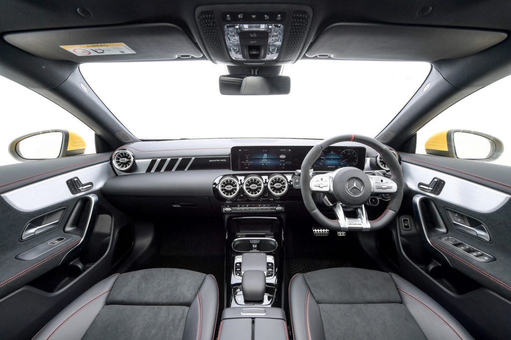 ดีไซน์ภายในเน้นความสปอร์ตสไตล์รถแข่งในทุกรายละเอียด เริ่มตั้งแต่เบาะนั่งสปอร์ต AMG Sport seat ที่ให้ความรู้สึกราวกับเป็นนักแข่ง พร้อมการควบคุมพวงมาลัยแบบ AMG Performance steering wheel โดยปุ่มควบคุมบนพวงมาลัยยังจัดวางให้ใช้ง่ายเพื่อสมาธิในการขับขี่ที่ดีเยี่ยม มาพร้อมกับ AMG steering wheel buttons ตามแบบฉบับสไตล์นักแข่ง Formula 1 ที่สามารถเปลี่ยนโหมดการขับขี่ได้อย่างรวดเร็วเพียงปลายนิ้วสัมผัส พร้อมเพลิดเพลินไปกับหน้าจอแสดงผลขนาดใหญ่พิเศษ 2 จอต่อเนื่องของระบบปฏิบัติการมัลติมีเดียแบบ MBUX ที่สามารถเปลี่ยนรูปแบบการแสดงผลของหน้าจอ พร้อมสะดวกสบายด้วยระบบสัมผัส AMG centre console คอนโซลกลางที่ควบคุมฟังก์ชันการขับขี่ที่หลากหลาย พร้อมโปรแกรมควบคุมการทรงตัวอัตโนมัติ ESP® เพื่อการควบคุมการขับขี่ที่สะดวกสบายยิ่งขึ้น