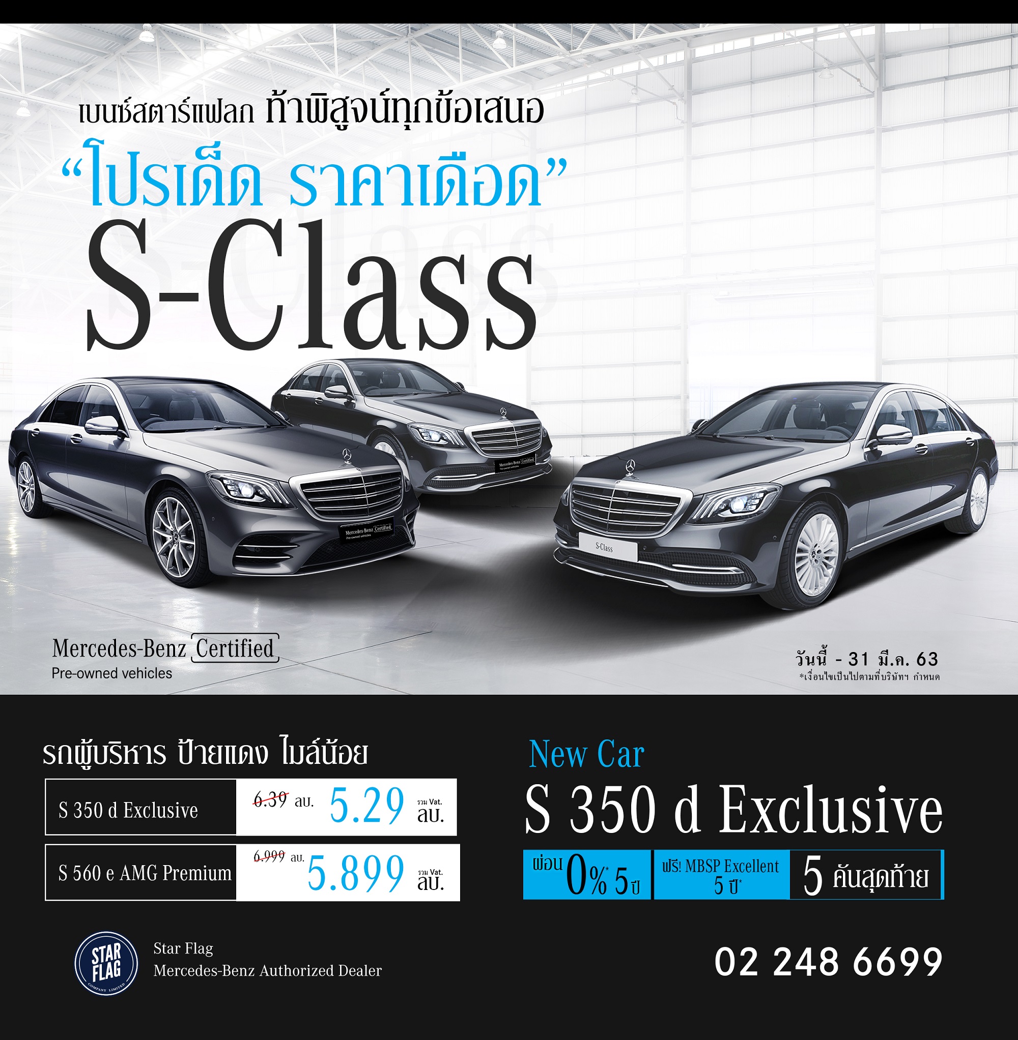 นายชยุส ยังพิชิต กรรมการผู้จัดการใหญ่ บริษัท สตาร์แฟลก จำกัด ในนาม เบนซ์สตาร์แฟลกผู้จำหน่ายรถยนต์เมอร์เซเดส-เบนซ์อย่างเป็นทางการ กล่าวว่า “ในเดือน มีนาคม 2563 นี้ เบนซ์สตาร์แฟลกขอท้าพิสูจน์ข้อเสนอ “โปรเด็ด ราคาเดือด” ที่จะชวนลูกค้าทุกท่านมาสัมผัสและจับจองเป็นเจ้าของ S-Class ในราคาที่พิเศษและคุ้มค่าที่สุด จำนวนจำกัดวันนี้– 31 มีนาคม2563ครับ”