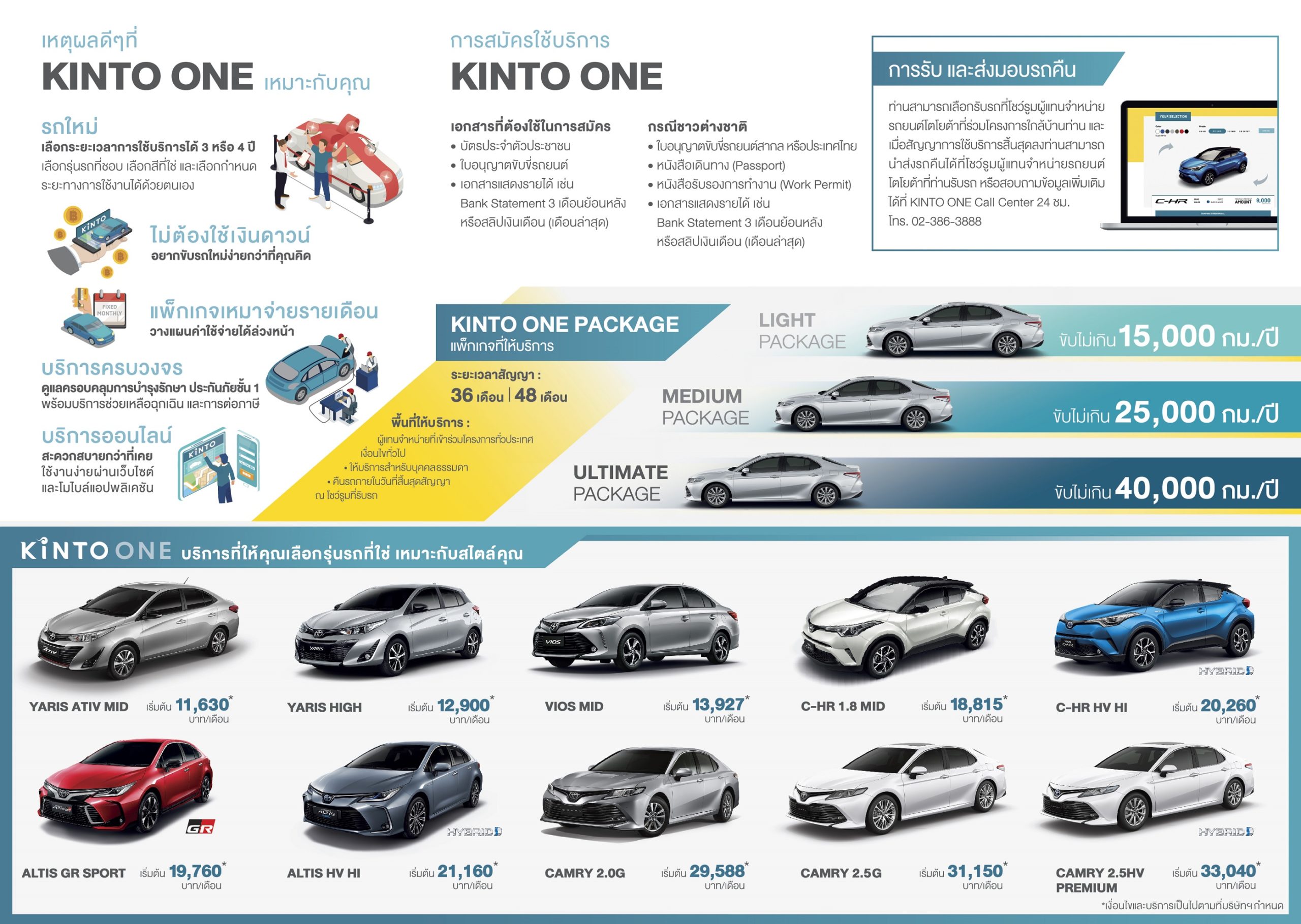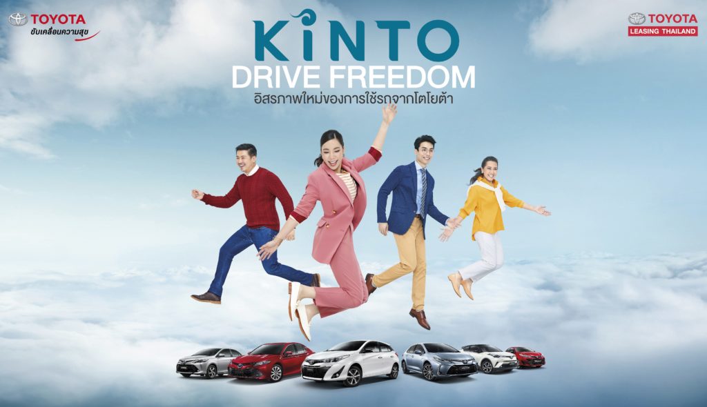บริษัท โตโยต้า มอเตอร์ ประเทศไทย จำกัด ร่วมมือกับบริษัทโตโยต้า ลีสซิ่ง (ประเทศไทย) จำกัดนำเสนอบริการ “KINTO” อิสรภาพใหม่ของการใช้รถจากโตโยต้าซึ่งเป็นธุรกิจออนไลน์รูปแบบใหม่เพื่อตอบรับกับไลฟ์สไตล์ของลูกค้าที่เปลี่ยนไป จากความต้องการเป็นเจ้าของรถยนต์ สู่การใช้งานรถยนต์ที่มีอิสระไร้ความกังวลกับค่าใช้จ่ายที่จะตามมาในอนาคตพร้อมแนะนำ “KINTO ONE” ธุรกิจออนไลน์รูปแบบใหม่ สำหรับลูกค้าบุคคลเช่ารถระยะยาวเพียงจ่ายค่าบริการรายเดือนราคาเดียวตลอดอายุสัญญาพร้อมด้วยการให้บริการออนไลน์อย่างเต็มรูปแบบ ไม่ต้องมีเงินดาวน์อีกทั้งยังสามารถรับบริการการบำรุงรักษาดูแลรถยนต์ฟรีจากศูนย์บริการโตโยต้าตลอดอายุการใช้งานรวมทั้งหมดความกังวลเรื่องราคาขายต่อของรถยนต์ในอนาคตซึ่งเหมาะสมอย่างยิ่งสำหรับไลฟ์สไตล์การใช้ชีวิตของลูกค้าในยุคปัจจุบัน ทั้งหมดนี้ถือเป็นความสุขรูปแบบใหม่จากโตโยต้า ที่จะสร้างประสบการณ์.ใหม่ให้แก่ผู้ใช้รถยนต์ในประเทศไทยต่อไป