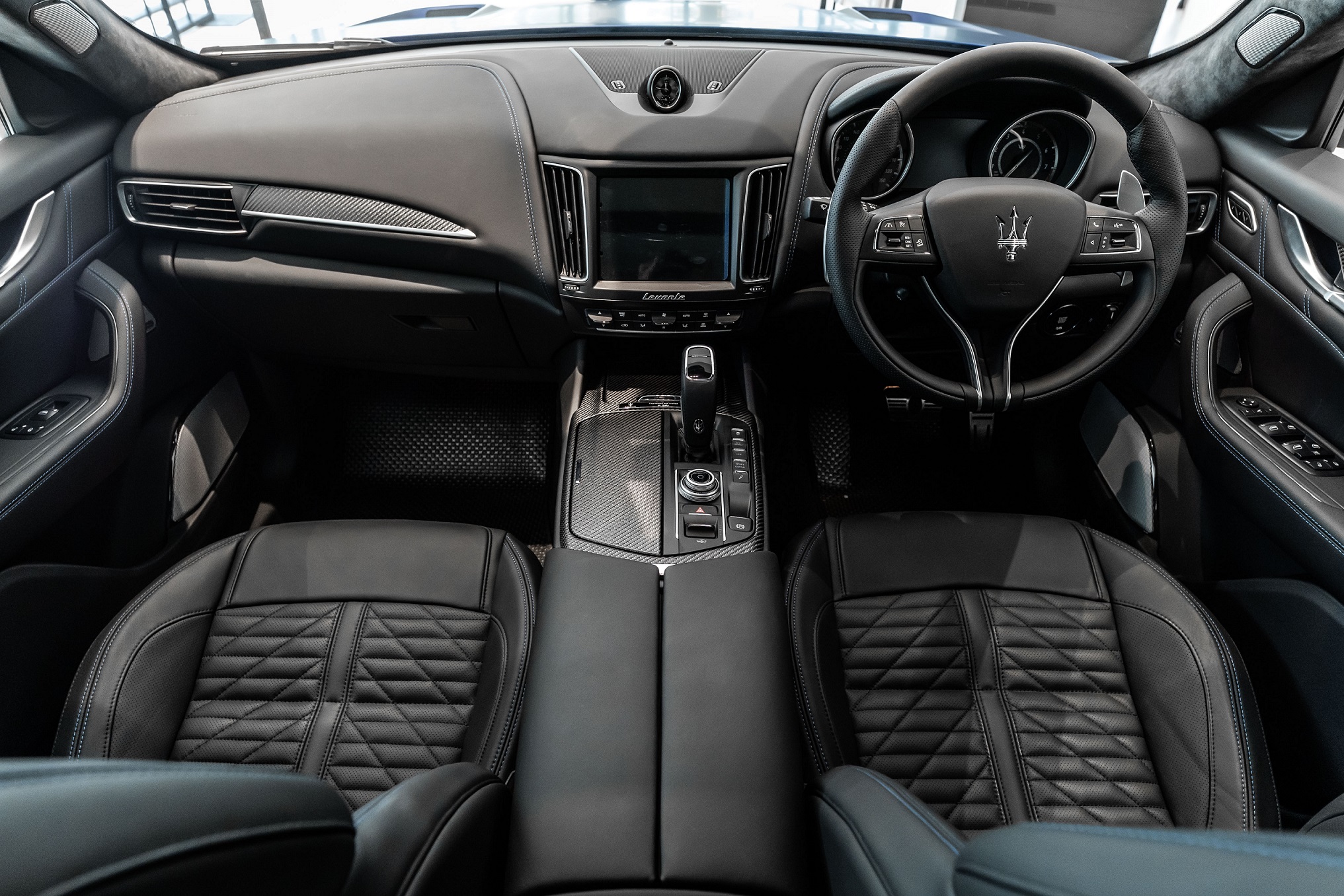 มาเซราติ เลอวานเต้ รุ่น โทรเฟโอ ลอนช์ เอดิชั่น ตัวถังพ่นสีน้ำเงินด้าน ‘Blu Emozione Matte’ ผสานชุดแต่ง Nerissimo Package ติดตั้งไฟหน้าฟูลเมทริกซ์แอลอีดี กระจังหน้าทรงตั้งสีดำเปียโนแบล็ค พร้อมช่องดักลมแบบตาข่ายด้านล่างช่องดักอากาศด้านข้างบริเวณส่วนล่างของกระจังหน้า ปรับแต่งใหม่ให้มีรูปลักษณ์ดุดันขึ้น มีลักษณะคล้ายปีก รีดอากาศให้กดลงบนล้อคู่หน้า เพิ่มสเถียรภาพช่วงความเร็วสูง ฝากระโปรงหน้าคาร์บอนไฟเบอร์พร้อมช่องระบายอากาศ ฝาครอบเครื่องยนต์ผลิตจากคาร์บอนไฟเบอร์มันวาว พร้อมสัญลักษณ์ V8 และโลโก้ตรีศูล ส่วนฝาสูบและท่อไอดีก็ถูกพ่นสีแดงให้ดูสปอร์ต ขณะที่มุมมองด้านหลังดูบึกบึนและกว้างขึ้น ติดตั้งโลโก้สัญลักษณ์ ‘SaettaTrofeo’บริเวณเสาซีพร้อมตกแต่งด้วยเพลทคาร์บอนไฟเบอร์และสปอยเลอร์กันชนหลังสีเดียวกับตัวถัง ล้อมรอบปลายท่อไอเสียแบบคู่ ยิงออก 2 ฝั่ง