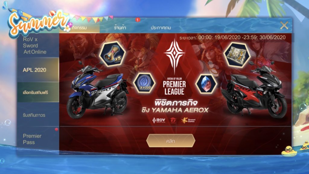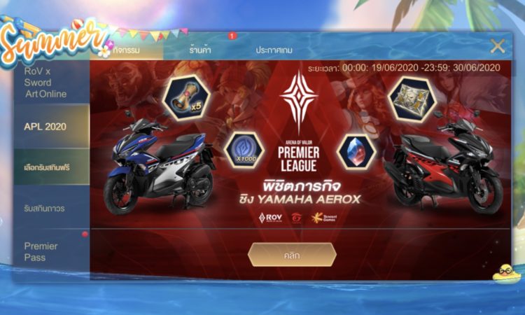 สาวก RoVเล่นเกมปลดล็อครางวัลในเซิร์ฟ และร่วมลุ้นเป็นเจ้าของยามาฮ่า แอร็อกซ์ 155 ได้ ตั้งแต่วันนี้ ถึง วันที่ 26 กรกฎาคม 2563 เวลา 23.59 น
