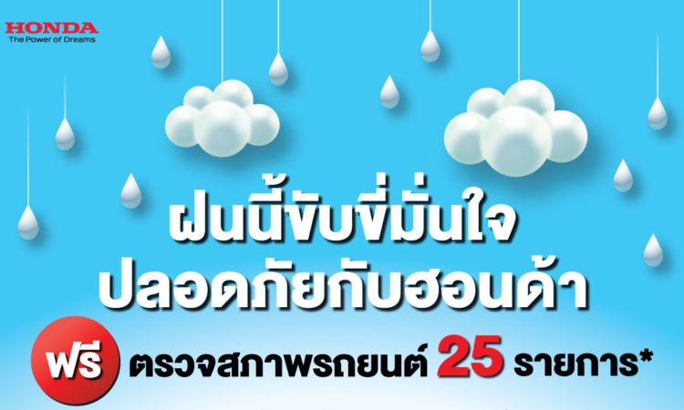 บริษัท ฮอนด้า ออโตโมบิล (ประเทศไทย) จำกัดส่งต่อความห่วงใยรับหน้าฝนผ่านแคมเปญ “ฝนนี้ ขับขี่มั่นใจ ปลอดภัยกับฮอนด้า” ชวนลูกค้าเตรียมความพร้อมด้านความปลอดภัยและสร้างความมั่นใจในทุกการเดินทางตลอดฤดูฝน ด้วยการนำรถยนต์เข้ารับการบริการตรวจเช็กสภาพรถยนต์ฟรี 25 รายการ พร้อมรับบริการฉีดพ่นน้ำยาฆ่าเชื้อโรคภายในรถยนต์ เมื่อนำรถยนต์