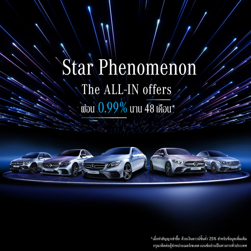 แคมเปญ “Star Phenomenon”ของเมอร์เซเดส-เบนซ์พร้อมมอบข้อเสนอพิเศษ ดอกเบี้ย 0.99% สำหรับเงินดาวน์ขั้นต่ำ 25%นาน 48เดือนสำหรับรถยนต์เมอร์เซเดส-เบนซ์ทุกรุ่น ผู้สนใจสามารถสอบถามรายละเอียดเพิ่มเติมได้ที่ผู้จำหน่ายรถยนต์เมอร์เซเดส-เบนซ์อย่างเป็นทางการทั่วประเทศ ตั้งแต่วันที่ 10-31กรกฎาคมนี้