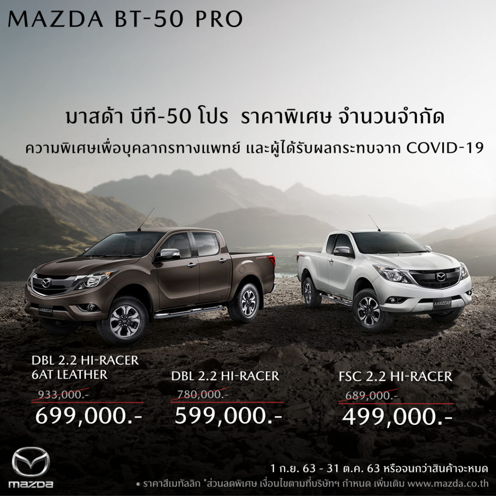 นอกจากยอดขายที่ร้อนแรงต่อเนื่องแล้ว เพื่อเป็นการขอบคุณบุคลาการทางการแพทย์และช่วยเหลือผู้ที่ได้รับผลกระทบจากการระบาดของโควิด-19 สำหรับทุกคนไม่มีข้อยกเว้น ไม่มีหมายเหตุ ไม่มีข้อจำกัด แต่ต้องรีบไปซื้อ เพราะมีจำนวนจำกัด โดยมาสด้ามอบส่วนลดพิเศษสำหรับลูกค้ามาสด้า บีที-50 โปร ที่ต้องการนำรถปิกอัพเพื่อไปใช้ในการดำเนินชีวิตและเสริมสร้างอาชีพ หรือเพื่อต่อยอดให้ธุรกิจสามารถเดินหน้าต่อไปได้ มาสด้ายินดีมอบส่วนลดสูงสุดถึง 234,000 บาท ด้วยราคาพิเศษเพียง 499,000 บาท สำหรับรุ่นฟรีสไตล์แค็ปขับสองแบบยกสูง FSC Hi-Racer รุ่นดับเบิ้ลแค็ป 4 ประตู แบบขับสองยกสูง DBL Hi-Racer คาราพิเศษเพียง 599,000 บาท และรุ่นดับเบิ้ลแค็ป 4 ประตู ขับสองแบบยกสูง เกียร์อัตโนมัติ 6 สปีด DBL Hi-Racer AT เบาะหนัง ราคาพิเศษเพียง 699,000 บาทเท่านั้น ทั้งหมดนี้มีจำนวนจำกัด ติดต่อสอบถามได้ทุกโชว์รูมทั่วประเทศ