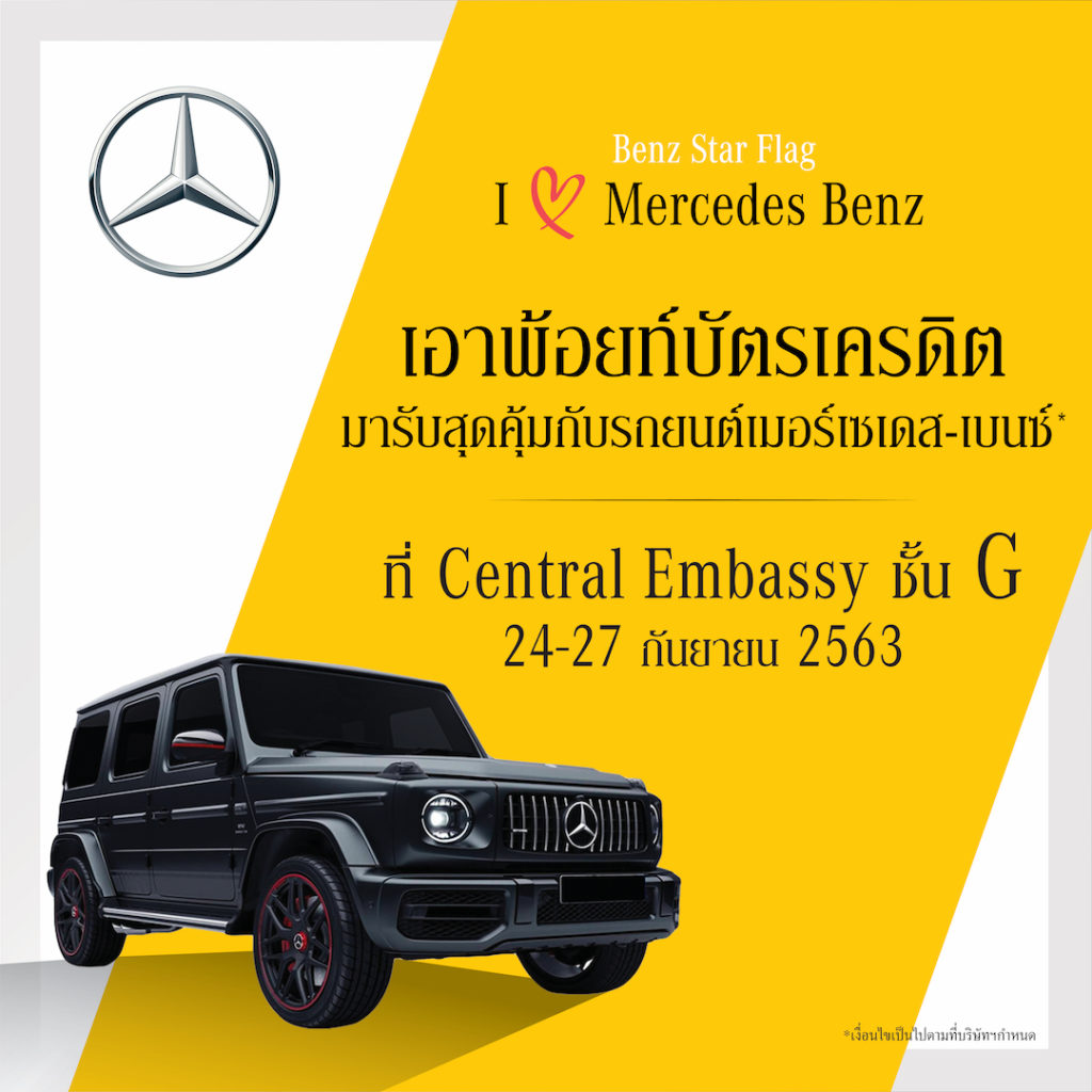 บริษัท สตาร์แฟลก จำกัด ผู้แทนจำหน่ายรถยนต์เมอร์เซเดส-เบนซ์อย่างเป็นทางการต่อยอดความสำเร็จและเสียงตอบรับ จากแคมเปญที่ผ่านมา สู่การจัดงานเปิดตัวแคมเปญยิ่งใหญ่ให้สิทธิประโยชน์ที่มากกว่า ใน “I Love Mercedes-Benz at Central Embassy”ที่ครั้งนี้พิเศษสุดๆกับโปรโมชั่นสะเทือนวงการ เอาพ้อยท์บัตรเครดิตมารับสุดคุ้มกับรถยนต์ เมอร์เซเดส-เบนซ์(*เงื่อนไขเป็นไปตามที่บริษัทฯกำหนด)ไม่ว่าจะมีพอยท์เยอะ พอยท์เหลือ หรือจะใช้แลกรับบริการที่ศูนย์บริการหลังการขาย ศูนย์ซ่อมสีและตัวถัง อีกทั้งยังใช้พอยท์บัตรเครดิตของท่านมาเป็นส่วนลดไว้เลือกช้อปกับมุม Benz Star Flag Accessory Collection ได้อีก ในวันที่ 24-27 กันยายน 2563นี้เท่านั้น ณ ศูนย์การค้า เซ็นทรัล เอ็มบาสซี ชั้น Gห้ามพลาด!