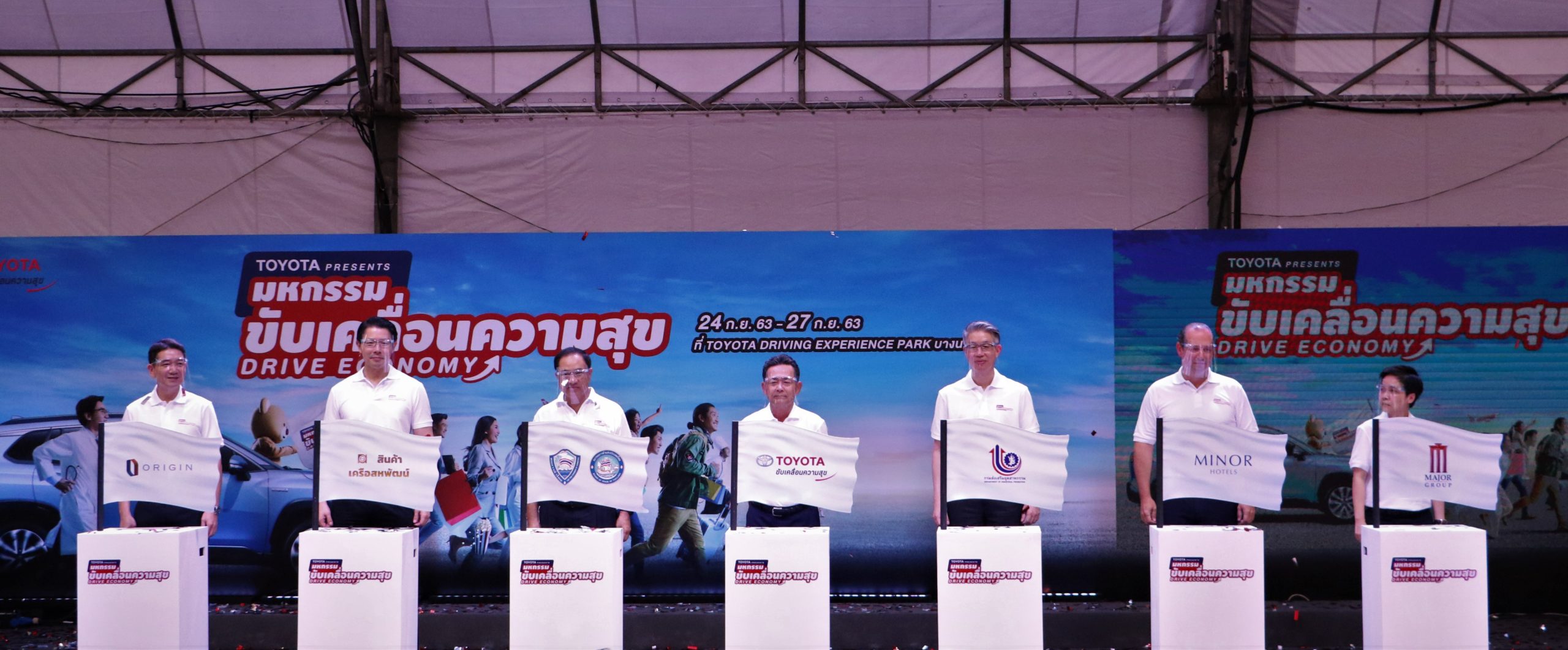นายกลินท์ สารสิน ประธานสภาหอการค้าแห่งประเทศไทย ดร.ณัฐพล รังสิตพล อธิบดีกรมส่งเสริมอุตสาหกรรม และนายมิจิโนบุ ซึงาตะ กรรมการผู้จัดการใหญ่ บริษัท โตโยต้า มอเตอร์ ประเทศไทย จำกัด พร้อมด้วย นายพิภพ โชควัฒนา กรรมการบริหาร บริษัท สหพัฒนาอินเตอร์โฮลดิ้ง จำกัด (มหาชน) นายโทมัส ไมเออร์ รองประธานอาวุโสฝ่ายปฏิบัติการ (เอเชีย) ของกลุ่ม ไมเนอร์ โฮเทลส์ ในเครือ บริษัท ไมเนอร์ อินเตอร์เนชั่นแนล จำกัด (มหาชน) นายพีระพงศ์ จรูญเอก ประธานเจ้าหน้าที่บริหาร บริษัท ออริจิ้น พร็อพเพอร์ตี้ จำกัด (มหาชน) นางสาวกนกนภา สายหรุ่น ผู้อำนวยการฝ่ายบริหารงานลูกค้า บริษัท เมเจอร์ ซีนีเพล็กซ์ กรุ้ป จำกัด (มหาชน) และคณะผู้บริหาร บริษัท โตโยต้า มอเตอร์ ประเทศไทย จำกัด ร่วมแถลงข่าวเปิดงาน “มหกรรมขับเคลื่อนความสุข Drive Economy” ครั้งยิ่งใหญ่ รวมทุกงานแฟร์ไว้ในงานเดียว เพื่อกระตุ้นเศรษฐกิจไทยในรูปแบบวิถีใหม่ และส่งมอบความสุขที่หลากหลาย เมื่อวันที่ 24 กันยายน 2563