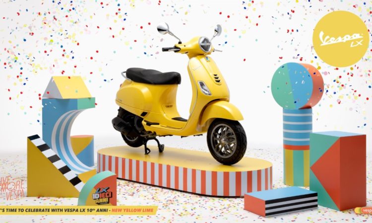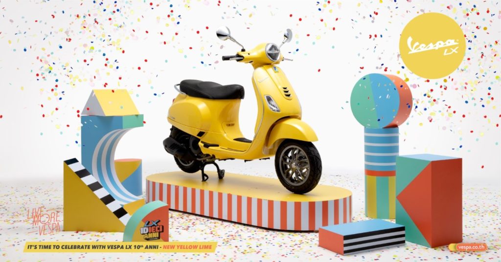 กลับมาสร้างสีสันอีกครั้งกับสกู๊ตเตอร์รุ่นพิเศษฉลองครบรอบ10 ปีกับ “Vespa LX 10thAnni”สีเหลืองพาสเทล (Yellow Lime) ใหม่!โดยความพิเศษของรุ่นนี้คือการนำสีที่เคยใช้เมื่อ 10 ปีที่แล้ว กลับมาอยู่บนตัวรถ LX รุ่นปัจจุบัน
