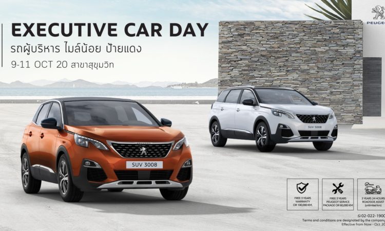 กิจกรรม ‘EXECUTIVE CAR DAY’ จะจัดขึ้นในวันที่ 9-11 ต.ค. ที่โชว์รูม เปอโยต์ ไลอ้อน ออโตโมบิล สุขุมวิท กับรถผู้บริหาร ป้ายแดง ไมล์น้อย กว่า 20 คัน ครบทั้งรุ่น 3008 เอสยูวี ราคาเริ่มต้น 1.509 ล้านบาทและ 5008 เอสยูวี 7 ที่นั่ง ราคาเริ่มต้น 1.709 ล้านบาท อุ่นใจกับการรับประกันคุณภาพนาน 3 ปี หรือ 100,000 กม. เปอโยต์เซอร์วิส แพ็คเกจ นาน 3 ปี หรือ 60,000 กม. และบริการช่วยเหลือฉุกเฉินตลอด 24 ชั่วโมง ฟรี 3 ปีไม่จำกัดระยะทาง