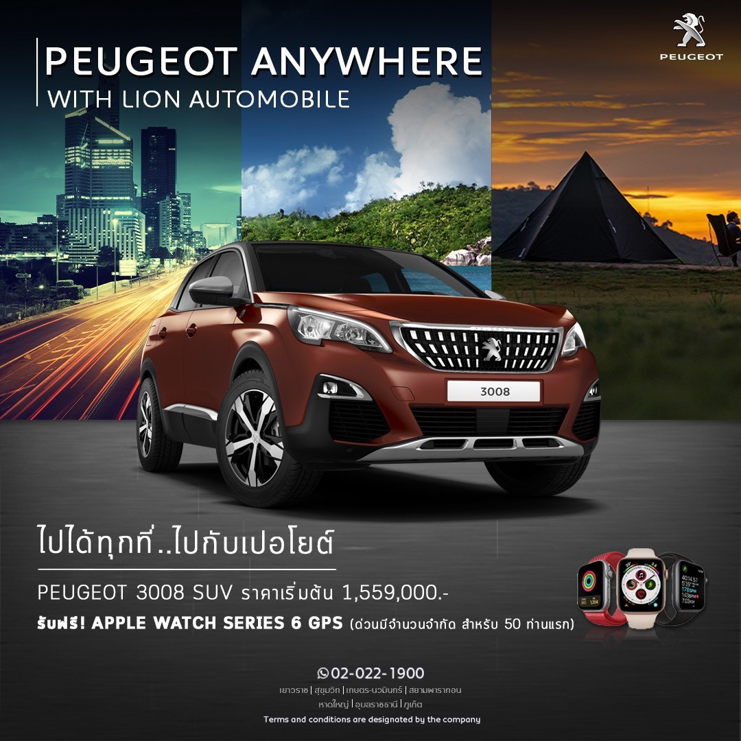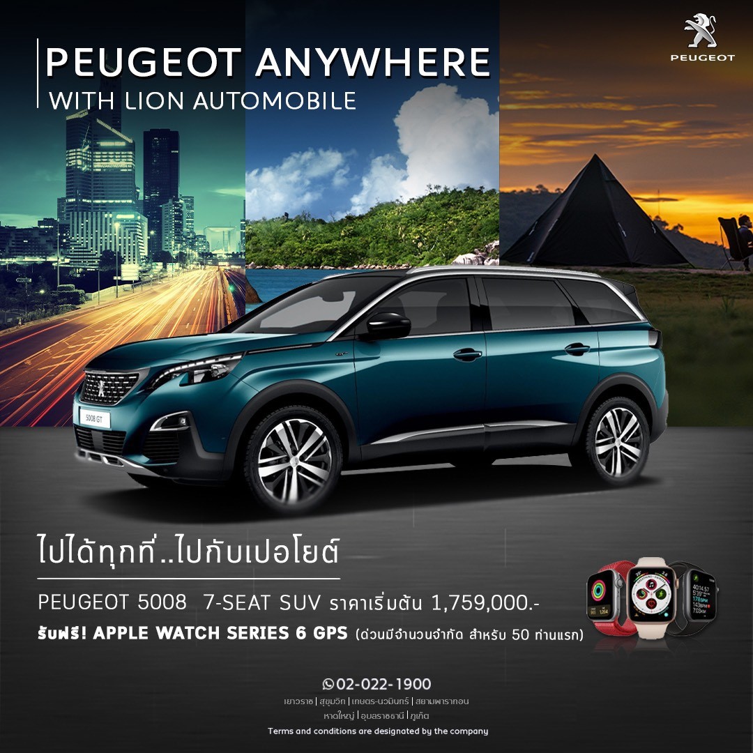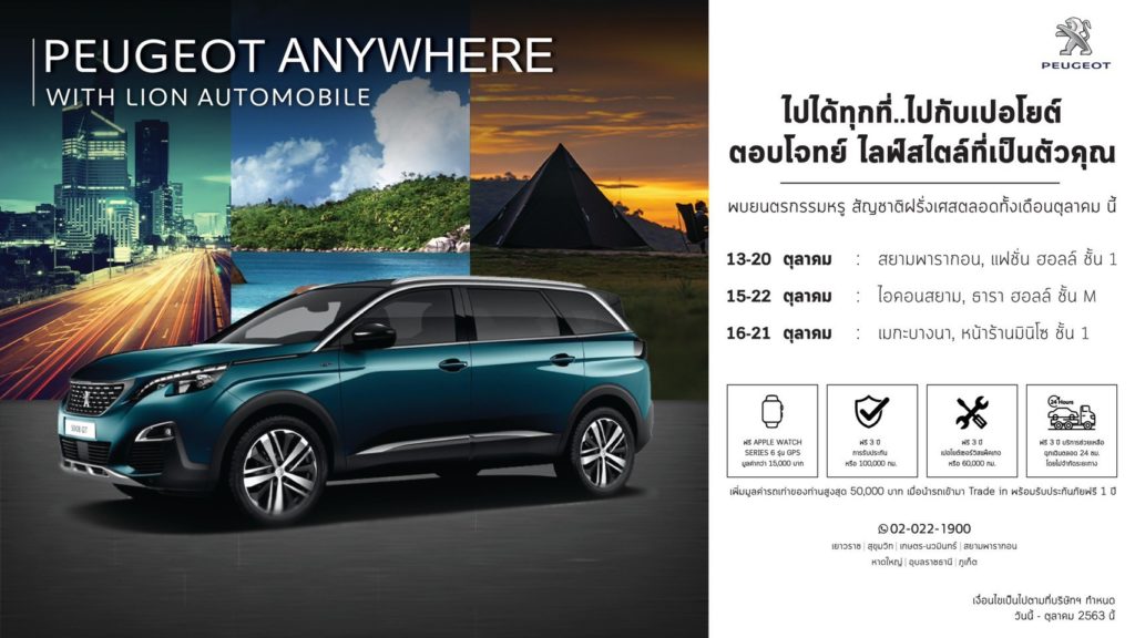 สัมผัส เปอโยต์ 3008 เอสยูวี และ 5008 เอสยูวี 7 ที่นั่ง อย่างใกล้ชิด ผ่านกิจกรรม ‘PEUGEOT ANYWHERE’ สื่อถึงการเป็นรถยนต์ที่สามารถขับไปได้ทุกที่ และใช้งานได้อย่างอเนกประสงค์ เวียนไปตามศูนย์การค้าต่างๆ ทั้งสยามพารากอน ไอคอนสยาม และเมกาบางนา ตลอดเดือนตุลาคมเปอโยต์ 3008 เอสยูวี และ เปอโยต์ 5008 เอสยูวี 7 ที่นั่ง รถทุกคันมาพร้อมการรับประกันคุณภาพนาน 3 ปี หรือ 100,000 กม. เปอโยต์เซอร์วิส แพ็คเกจ นาน 3 ปี หรือ 60,000 กม. และบริการช่วยเหลือฉุกเฉินตลอด 24 ชั่วโมง ฟรี 3 ปีไม่จำกัดระยะทาง พร้อมโปรโมชั่นสุดพิเศษเฉพาะในงาน