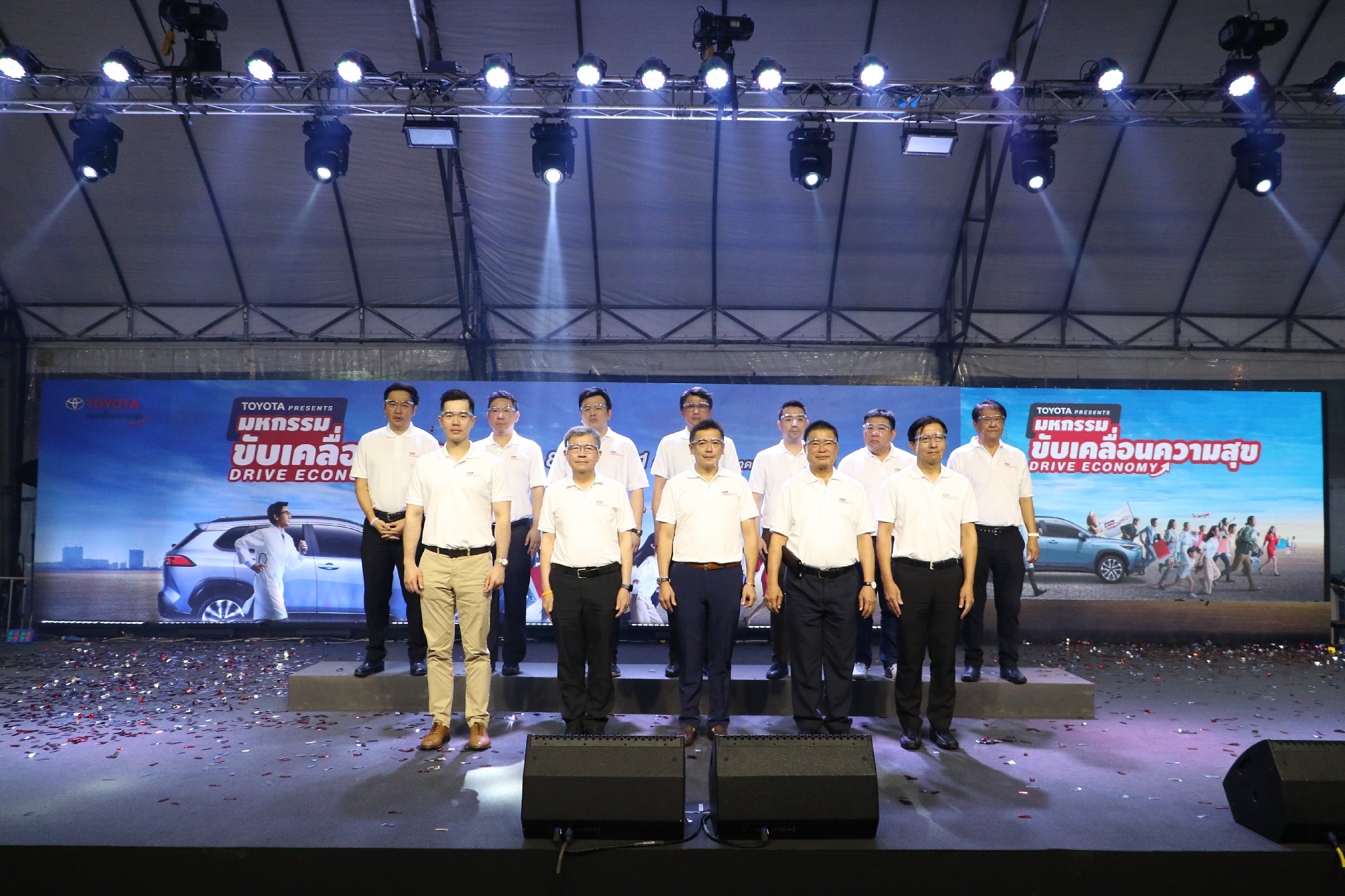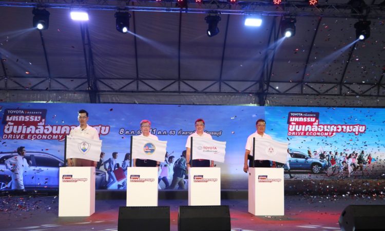 นายศุภชัยสินสุวรรณรักษ์ผู้ช่วยกรรมการผู้จัดการใหญ่บริษัทโตโยต้ามอเตอร์ประเทศไทยจำกัดพร้อมด้วยนายวิวัฒน์มหาผลศิริกุลรองผู้ว่าราชการจังหวัดชลบุรี นายธีรินทร์ธัญญวัฒนกุลประธานหอการค้าจังหวัดชลบุรี นายสมบูรณ์ตรีพรเจริญประธานสภาอุตสาหกรรมจังหวัดชลบุรี และผู้แทนจำหน่ายโตโยต้า ร่วมพิธีเปิดงาน “มหกรรมขับเคลื่อนความสุขDrive Economy”ครั้งยิ่งใหญ่ต่อเนื่องแห่งที่2เพื่อเดินหน้าส่งต่อความสุข และกระตุ้นเศรษฐกิจไทยภาคตะวันออกในรูปแบบวิถีใหม่เมื่อวันที่ 8 ตุลาคม 2563 ณ ตลาดนัดจตุจักรชลบุรี