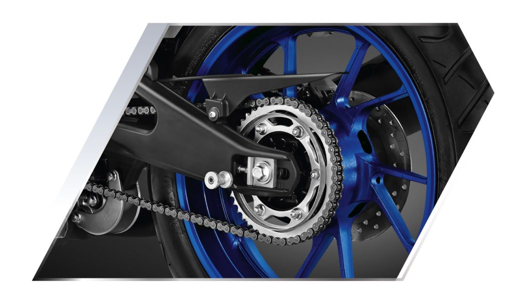 NEW YAMAHA R15 เร้าใจเต็มอารมณ์สปอร์ตด้วยโช้คอัพหน้าแบบ Upside Down ออกแบบให้จุดศูนย์ถ่วงต่ำ ดูดซับสภาพพื้นถนน เพิ่มสมรรถนะแห่งความนุ่มนวล NEW DESIGN ALUMINIUM REAR ARM สวิงอาร์มอลูมิเนียมดีไซน์ใหม่ ออกแบบใหม่ให้กว้างรองรับกับล้อแม็กและยางขนาดใหญ่ เบาแข็งแรงรับกับตัวรถขับขี่เร้าใจทั้งบนถนนและในสนาม