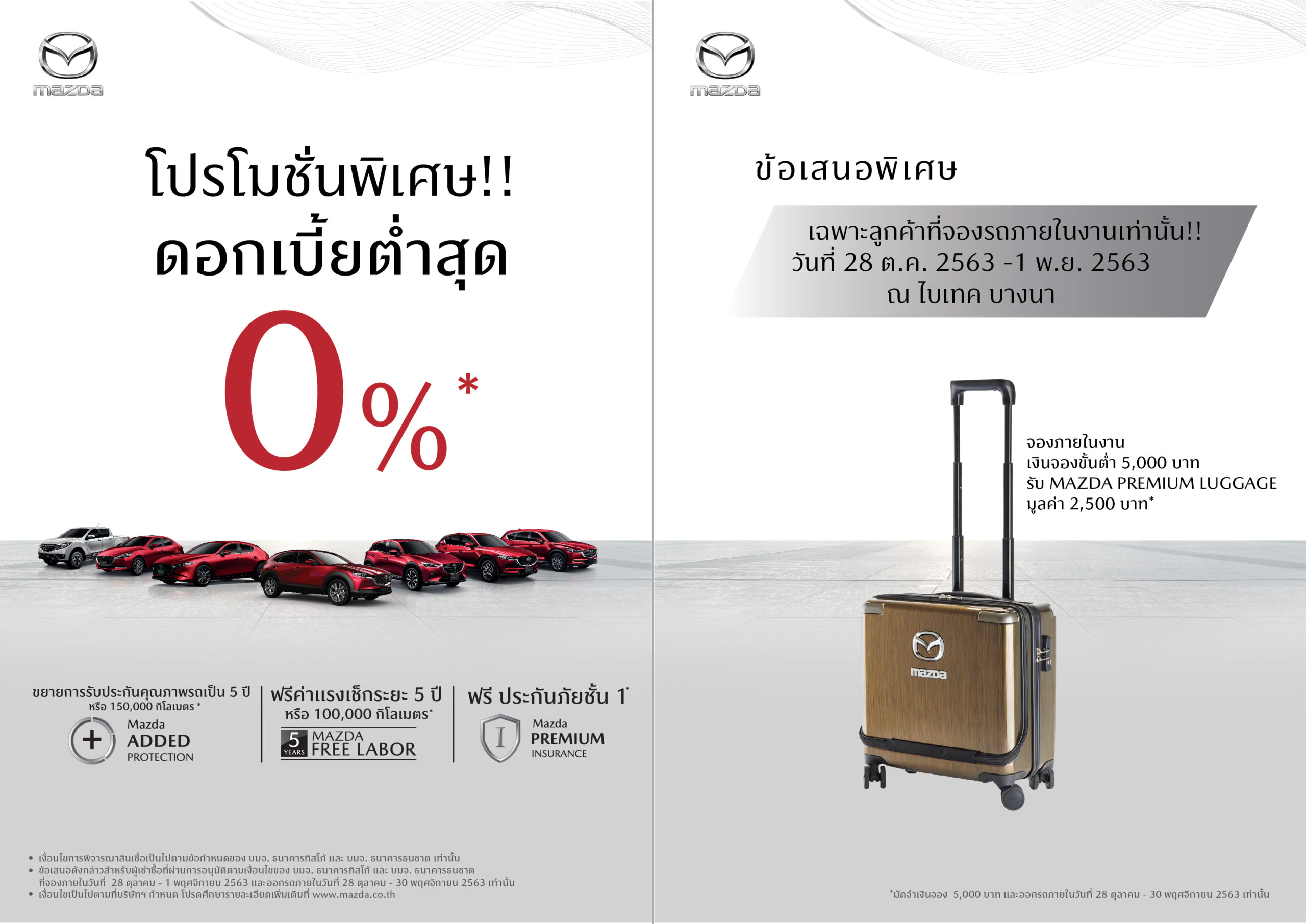 มาสด้าลุยงาน FAST Auto Show Thailand 2020 ยกขบวนรถยนต์มาสด้าภายใต้เทคโนโลยีสกายแอคทีฟและการออกแบบอันสง่างามของ โคโดะ ดีไซน์ หลากหลายรุ่นทั้งรถยนต์นั่งสุดปังอย่าง Mazda2, Mazda3 และ CX-30 ที่นำมาปรับลุคให้สวยงามมากยิ่งขึ้นด้วยชุดแต่งพิเศษแท้จากโรงงาน Signature Style และรถอเนกประสงค์ครอสโอเวอร์เอสยูวีตระกูล CX-Series ที่กำลังได้รับความนิยมอย่างสูงจากลูกค้า อาทิ CX-30, CX-5 และ CX-8 มาให้ลูกค้าสัมผัสกับความหรูหรา พรีเมียมแบบจัดเต็ม พร้อมมอบข้อเสนอสุดคุ้มกับอัตราดอกเบี้ยต่ำสุด 0% ฟรีประกันภัยชั้น 1 Mazda Premium Insurance 1 ปี ทุกรุ่น อุ่นใจตลอดการเดินทางด้วยโปรแกรมขยายการรับประกันคุณภาพรถยนต์นานสูงสุดถึง 5 ปี หรือ 150,000 กิโลเมตร เตรียมรับกระเป๋าเดินทาง MAZDA PREMIUM LUGGAGE มูลค่า 2,500 บาท เมื่อจองซื้อรถยนต์ทุกรุ่นภายในงานฯ ตั้งแต่ 5,000 บาทขึ้นไป และออกรถภายในวันที่ 30 พฤศจิกายนนี้